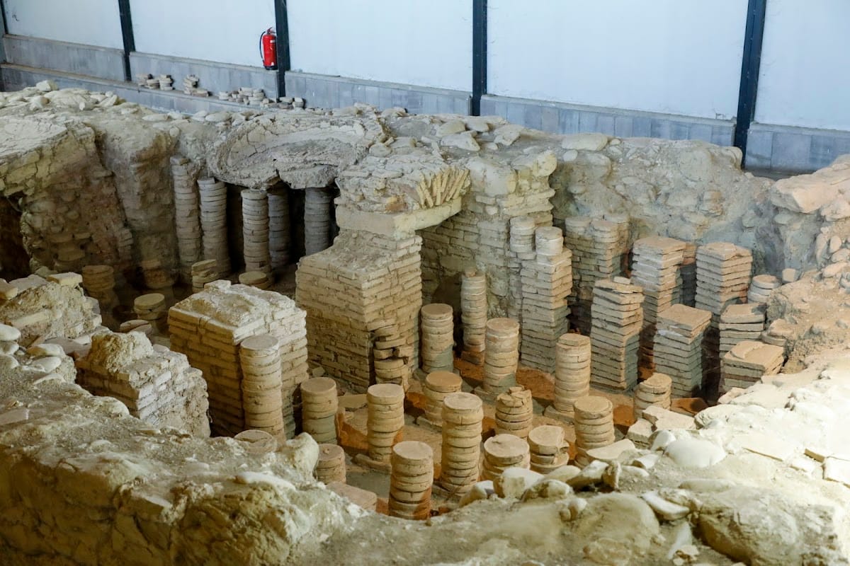 Adjacent to the palace lies a Roman-style bath complex divided into three equal sections—cold, warm, and hot baths—each approximately 5 meters long and 2.5 meters wide, with semicircular apses on the north and south sides. The warm and hot baths were heated by a hypocaust system supported by flat, square, and round bricks. The cold bath features a mosaic floor decorated with marine and plant motifs. A rectangular changing room, or apodyterium, measuring 4.9 by 4.7 meters, contains a floor with symmetrical geometric patterns.
