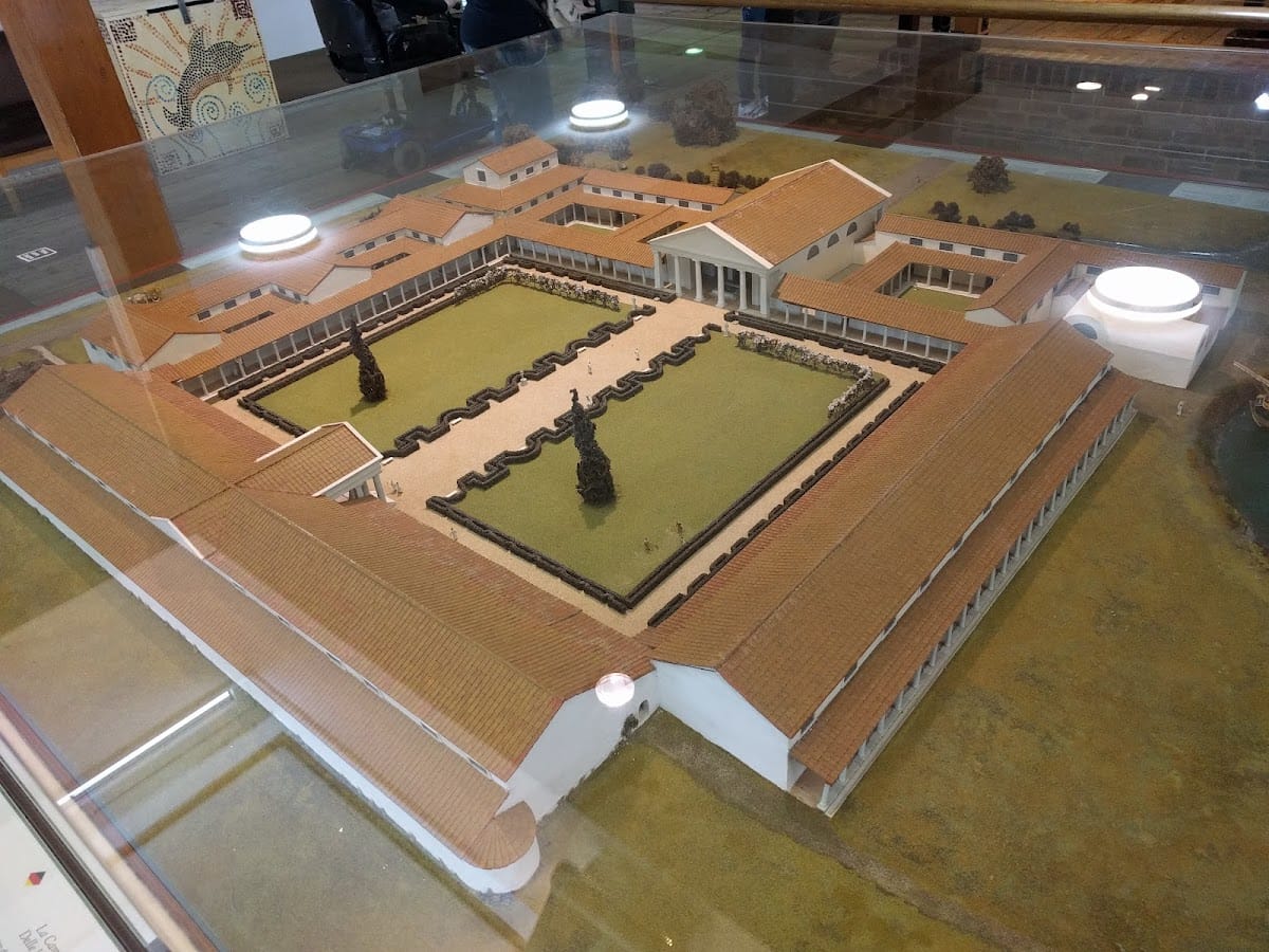 Between 75 and 80 AD, the full palace was constructed over about five years, incorporating the earlier proto-palace. This large complex featured four residential wings arranged around a formal courtyard garden. The palace underwent significant remodeling during the 2nd and 3rd centuries AD, which included the addition of bath suites and new mosaic floors, reflecting continued occupation and adaptation.