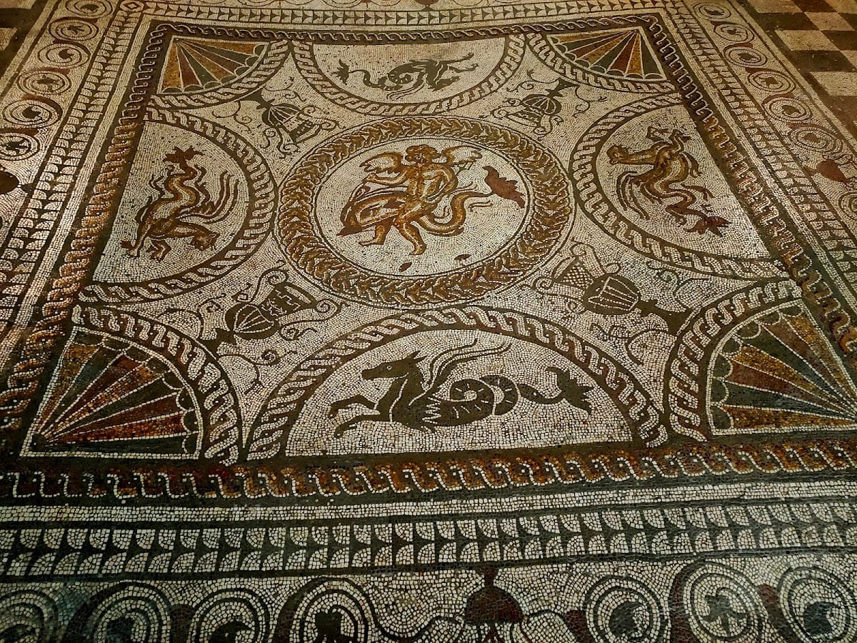 The palace contained around fifty mosaic floors. Early black and white mosaics were later overlaid by more elaborate polychrome designs, including notable examples like the Dolphin mosaic and the Medusa mosaic. The complex also incorporated underfloor central heating and an integral bathhouse, demonstrating advanced Roman engineering.