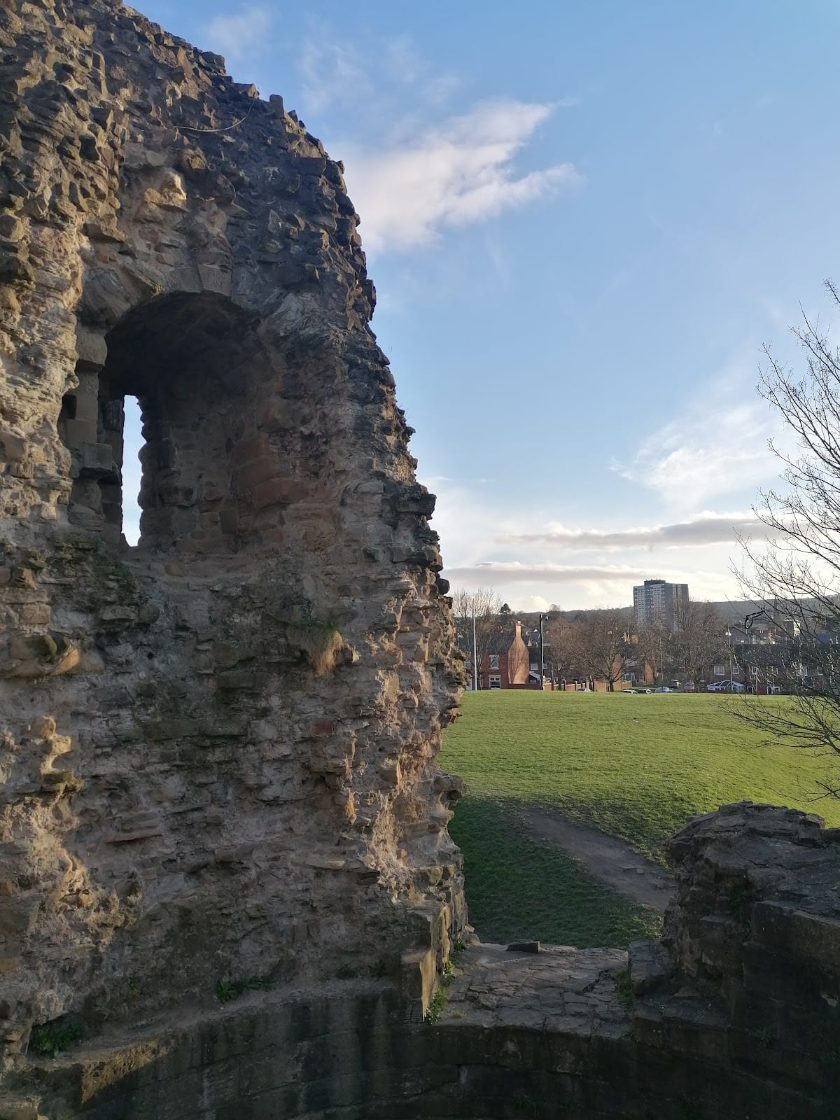 A particularly striking feature of Flint Castle is its freestanding, circular keep, also called the donjon, which stands apart from the curtain walls to provide an independent stronghold within the fortification. The keep has exceptionally thick walls, measuring about seven meters thick at the base and tapering to five meters thick higher up. It spans over 21 meters in diameter. Originally, access to the keep was granted by a drawbridge leading into a central chamber on the first floor. Above this were at least one or more floors containing small rooms built within the thick surrounding walls. The keep’s ground floor includes a vaulted passageway that runs around its interior, a structural feature providing strength and circulation. In 1301, a timber gallery was added on top of the keep to accommodate a visit by Edward, Prince of Wales. Surrounding the keep was a dry moat, giving it additional isolation and protection even within the castle grounds.