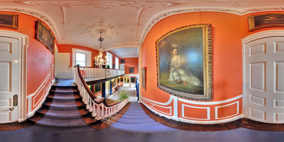 Inside, the castle contains a remarkable combined drawing room and library, remodeled in the 18th century under the guidance of Thomas Stocking. This room is illuminated by two Venetian-style windows: one made of stone facing west and a timber oriel window to the east. The ceiling is decorated with rococo plasterwork, considered among the finest in Wales. Designs include elaborate motifs such as hunting trophies, flowing arabesques, laurel wreaths, and a central Apollo head surrounded by a sunburst pattern.