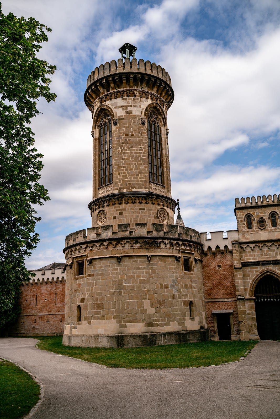 The western side of the castle is distinguished by features resembling a genuine medieval stronghold, including a high battlement wall equipped with defensive towers. In contrast, the eastern facade is marked by a tall observation tower, providing a vantage point over the surroundings. Incorporated within the structure are large medieval architectural fragments salvaged from significant historic buildings. Among these are elements from the parish church of Heiligenkreuz Monastery and pieces of the Speciosa chapel from Klosterneuburg, which have been carefully reconstructed as part of the castle.