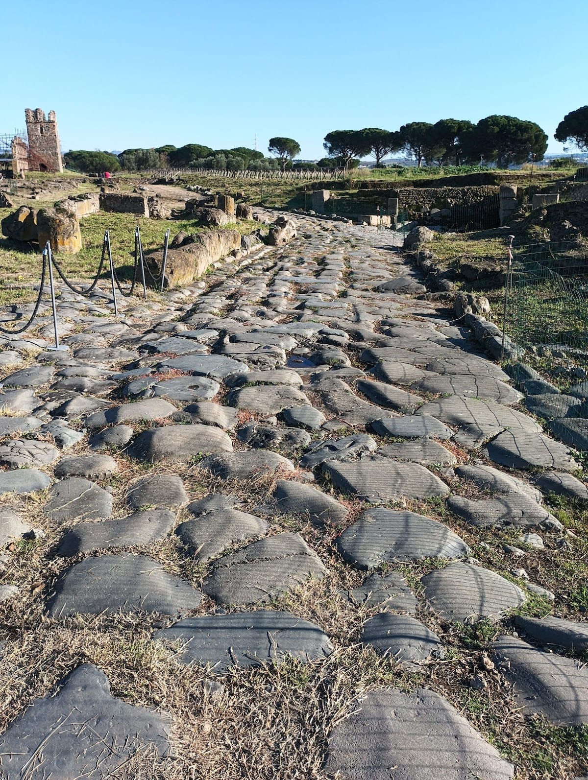 Geophysical surveys and excavations since 2007 have revealed a regularized street grid beneath the surface, with substantial portions of ancient city blocks uncovered. The Via Praenestina runs through the site as the main urban axis. The city was situated on an isthmus between two lakes, with two streams (Fosso dell’Osa and Fosso di San Giuliano) flanking it and crossed by bridges. This layout reflects integration of natural and built environments. Multi-period urban infrastructure includes drainage systems and road surfaces dating from the later first millennium BCE.