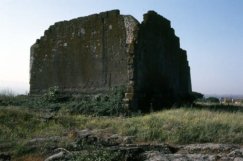 Extensive city walls constructed of squared Aniene tuff blocks date to the Archaic period. These fortifications enclosed the main urban area and incorporated the acropolis, which later became the site of the medieval Castiglione tower. The walls follow the natural topography of the isthmus, controlling access routes and watercourses. The medieval tower of Castiglione marks the ancient citadel’s location and gave its name to the former volcanic crater lake, Lago di Castiglione.