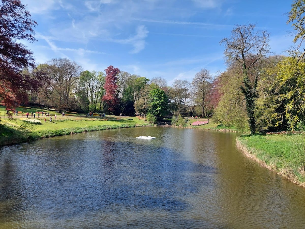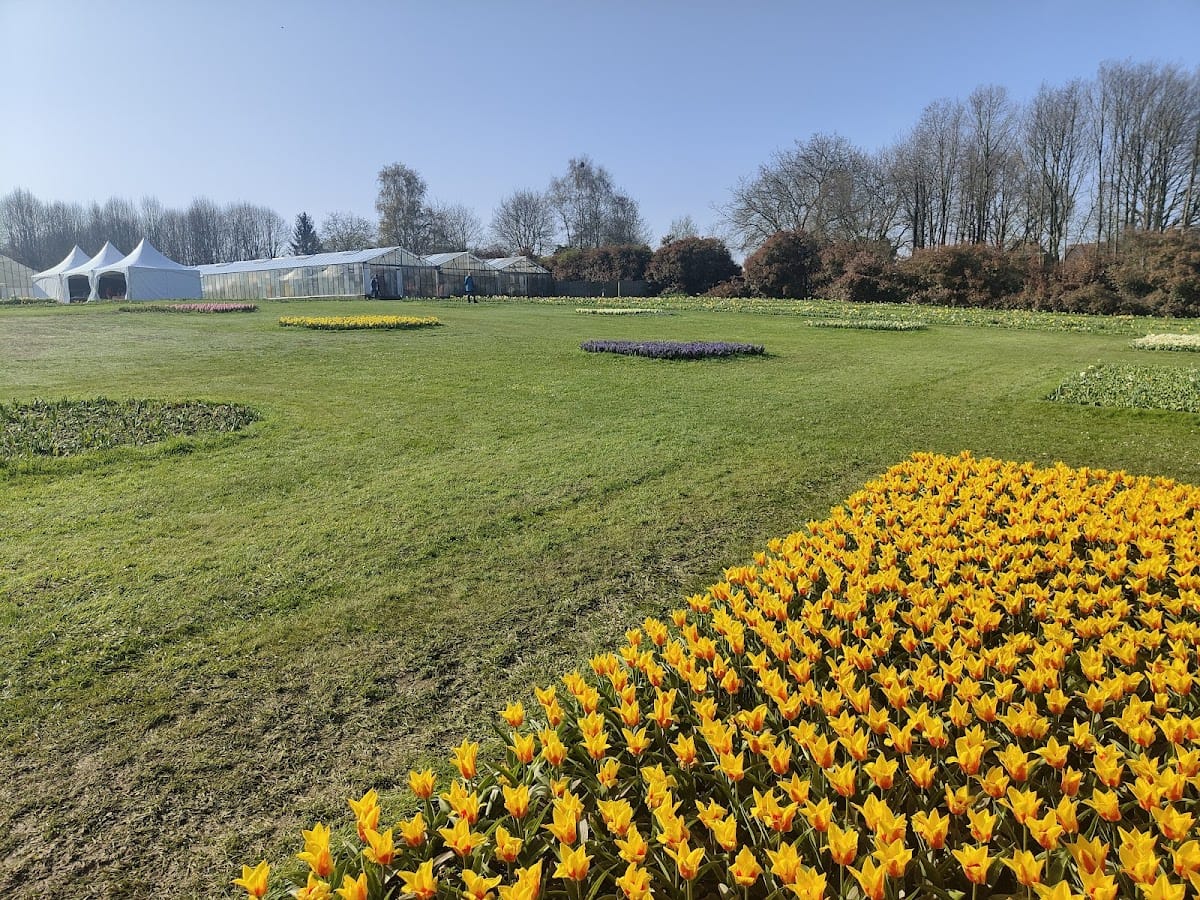 The castle is situated 47 meters (154 feet) above sea level and is surrounded by a 14-hectare park designed by Louis Fuchs in the early 20th century. This park hosts an annual international tulip exhibition featuring over 300 varieties and more than one million bulbs planted.