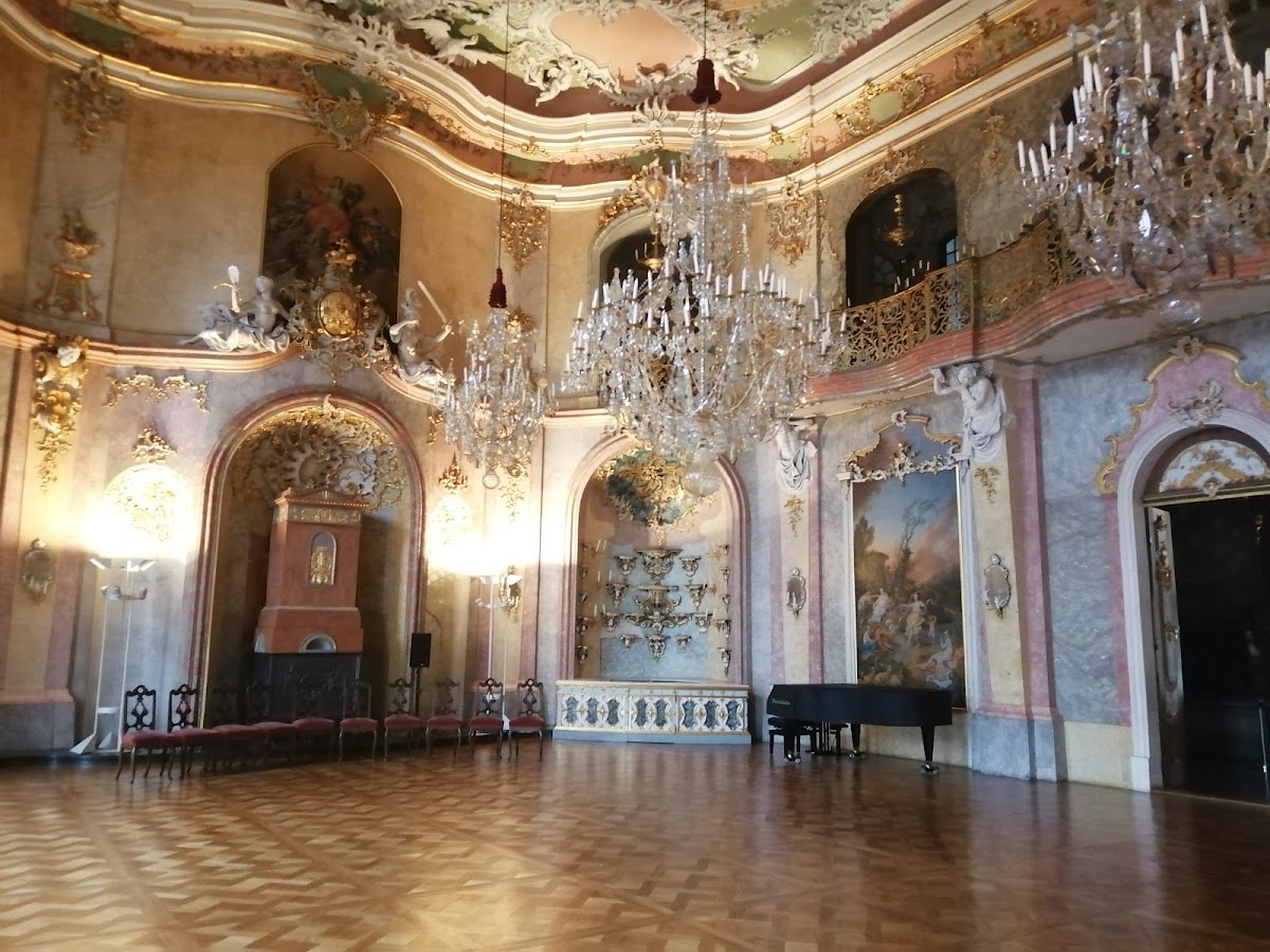 Flanking the festival hall are the “Red Rooms” on the south side, dating back to 1742, and the “Green Hall” to the north, finished in the 1770s. These adjoining rooms, richly adorned with stucco, painted ceilings and walls, along with intricate wood carvings, compose an ensemble of representative spaces linked by an elegant gallery and two staircases. This design facilitates smooth movement between rooms and highlights aristocratic tastes in interior design.