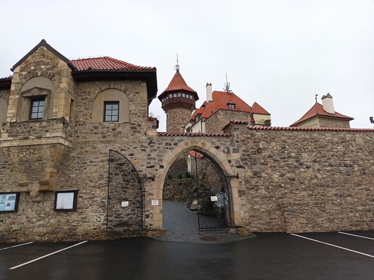 During the 1800s, the terrain of the castle hill was raised by several meters, and the old defensive wall was largely dismantled down to the moat. A new perimeter wall was likely built along the original line, and the front moat was reinforced by an earthen embankment to enhance protection. The stone lookout tower erected in 1900 was distinctively topped with glazed bricks sourced from a local chamotte brickworks in nearby Braňany, showcasing attention to regional materials.