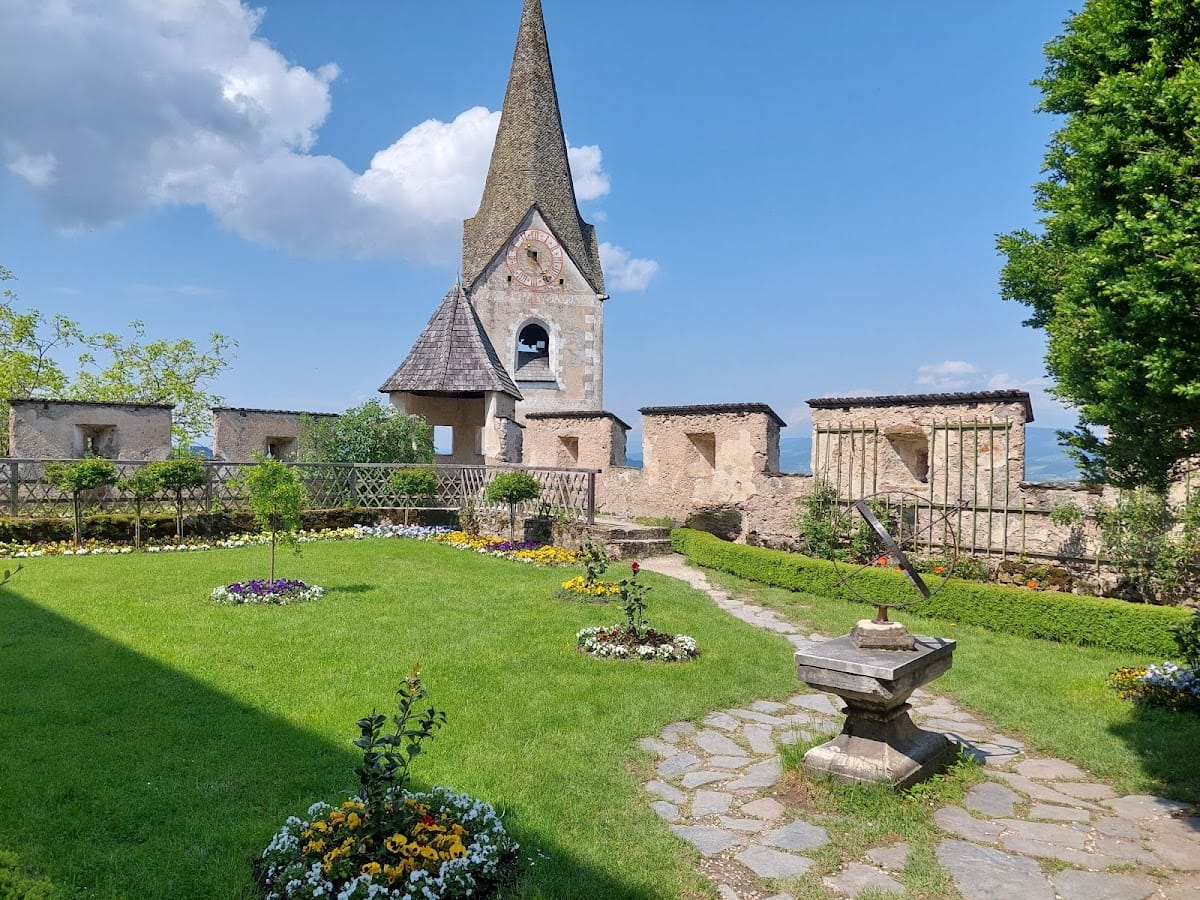 Inside the main courtyard stands a chestnut tree and a museum showcasing the Khevenhüller family’s history. Exhibits include armor, weapons, documents, and paintings. An inscription in the courtyard expresses the family’s wish to hold the castle forever and live virtuously. The St. Nicholas chapel features a barrel-vaulted ceiling painted with portraits of the apostles, a Baroque altar depicting the Holy Family, and a painted portal of the patron saint.