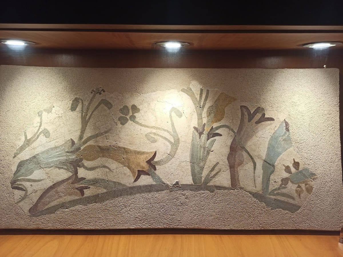 Decorative elements include mosaics of exceptional quality and surviving mural paintings on some walls, providing insight into the artistic preferences of the period. Structural remains such as column bases have also been identified, indicating the presence of porticoed spaces within the house. Smaller adjoining rooms surround the main halls and courtyard.