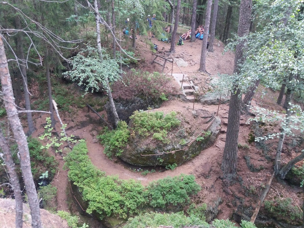 The ruins of Hrad u Brtníků are arranged across two distinct sandstone rock blocks separated by natural gaps that were deliberately widened to form ditches, enhancing the site’s defensibility. This two-part layout provided separate zones of function and protection within the stronghold.
