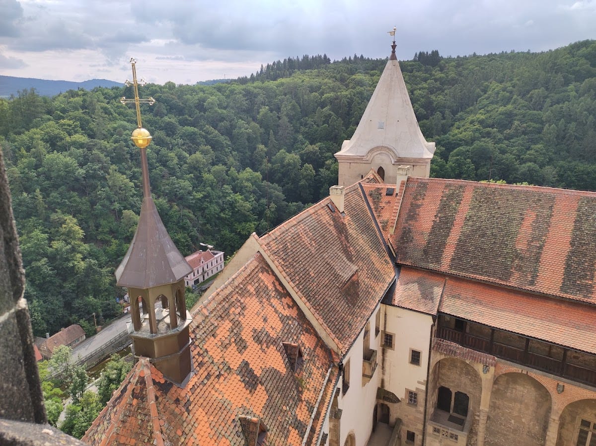 Inside the castle, the Stříbrnice treasury room preserves its original 15th-century oak doors, inscribed with a dated number, a rare surviving detail from this period. The prison area contains several cells showcasing instruments of torture used in the past. The Knight’s Hall holds a collection of Gothic art, and the King’s Hall is imposing, measuring 28 meters in length and standing 8.5 meters tall, with an intricate star vault adorning its ceiling. The castle library houses an extensive collection of roughly 53,000 volumes.