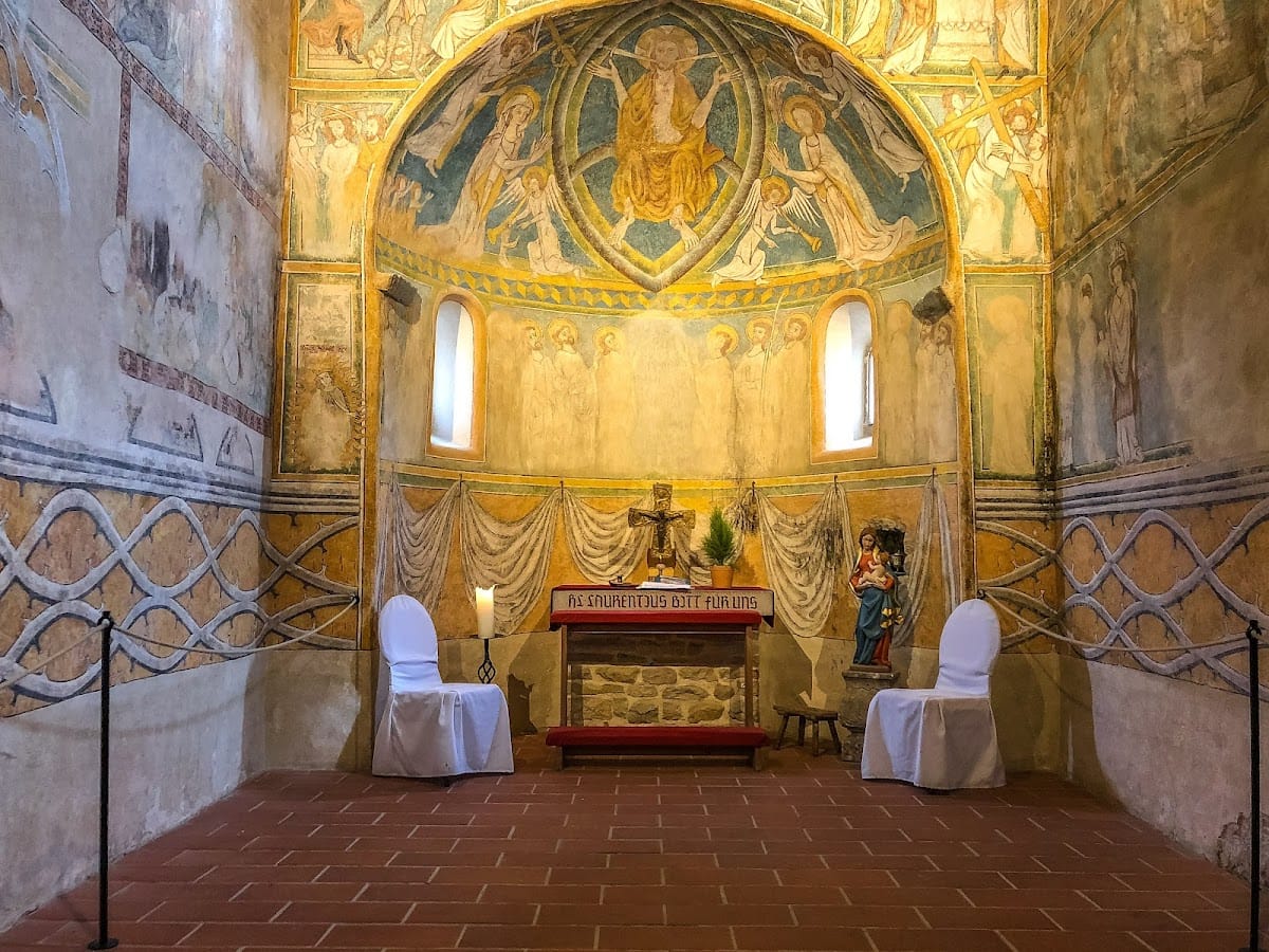 The castle chapel, dedicated to Saint Laurentius, dates to around the year 1000. It contains rare frescoes from the transitional period between late Romanesque and early Gothic art, created circa 1250 to 1280. Later Baroque paintings partially cover these medieval frescoes.