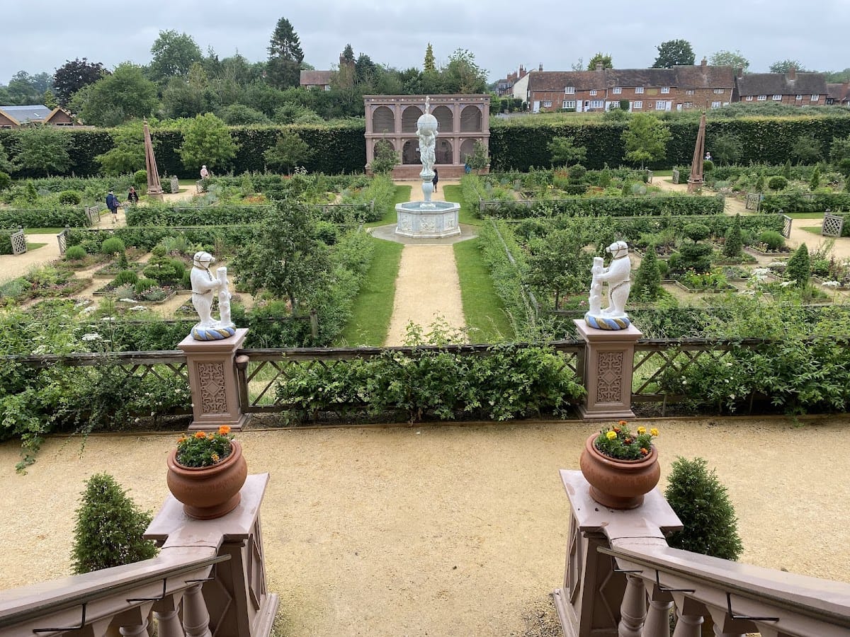 The castle garden occupies much of the right-hand court and reproduces the 1575 Elizabethan knot garden layout. It includes a steep terrace, eight square knot gardens, wooden obelisks painted to resemble porphyry stone, a marble fountain with Greek mythological figures, and a timber aviary.