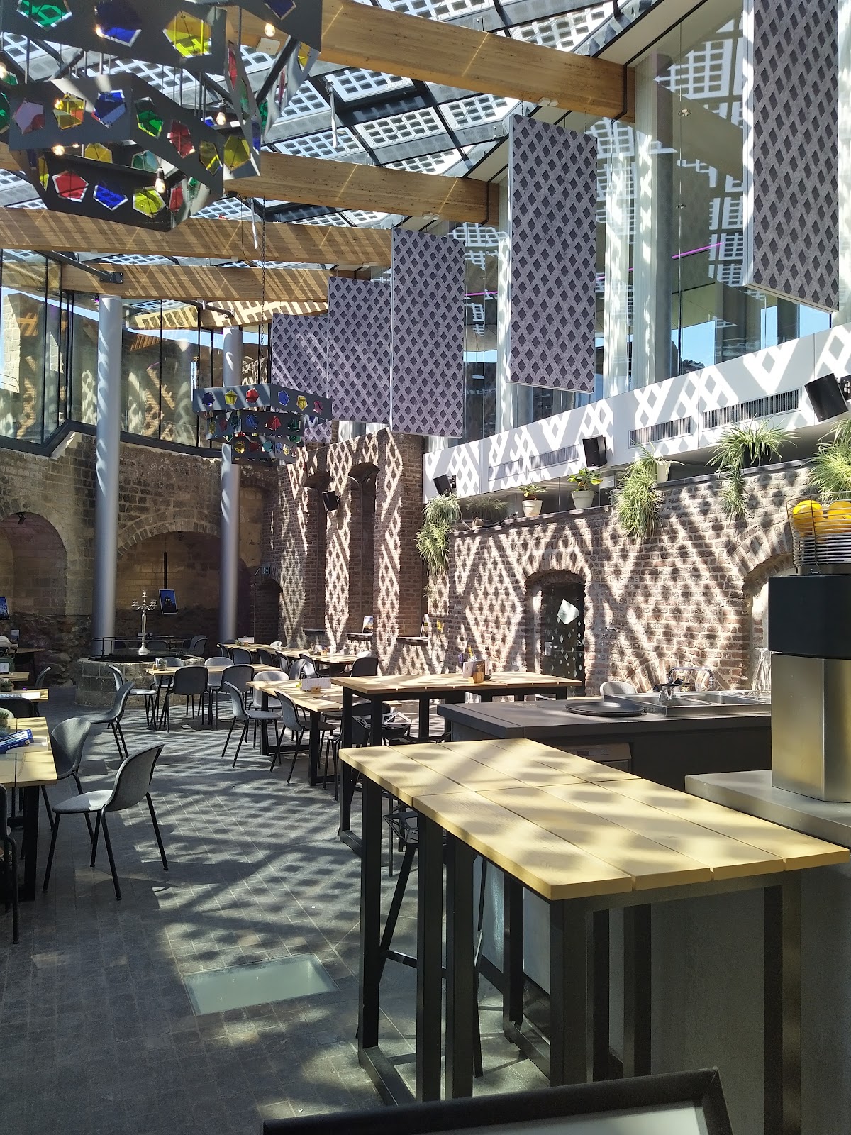 The restoration in 2015 introduced a contemporary annex constructed with slender columns that support concrete floors, while the roof was designed to resemble eighteenth-century styles and covered in slate tiles. Large glass panels replace traditional small dormer windows, allowing more light and creating a connection with the surrounding landscape. Glass facades fill the spaces between columns, and a gently sloping glass roof covers the courtyard, combining historic elements with modern architectural touches.