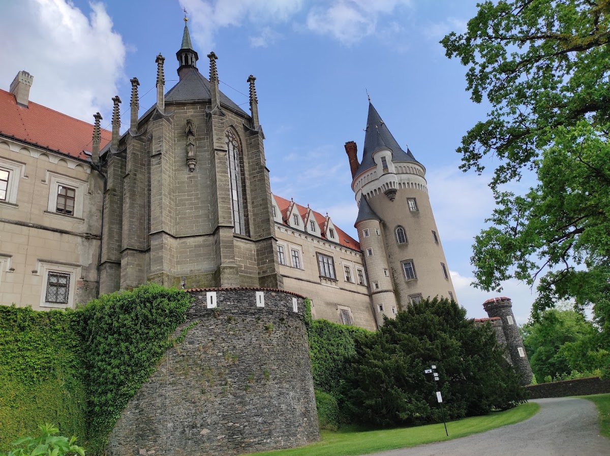 The 19th-century Neo-Gothic renovation introduced a more romanticized medieval appearance, significantly altering the castle’s profile. Architects incorporated three cylindrical towers and constructed a chapel between 1852 and 1857. Defensive-style exterior walls were added to enhance the castle’s fortress-like character. Access to the castle is marked by a sequence of three gates along a long approach road, with the first gate completed in 1878. The complex also includes a clock tower built in 1861–1862, the Holubová Tower which incorporates the third gate and forecourt defenses completed in 1864, and the Veliká Tower, featuring the second gate constructed between 1864 and 1878.