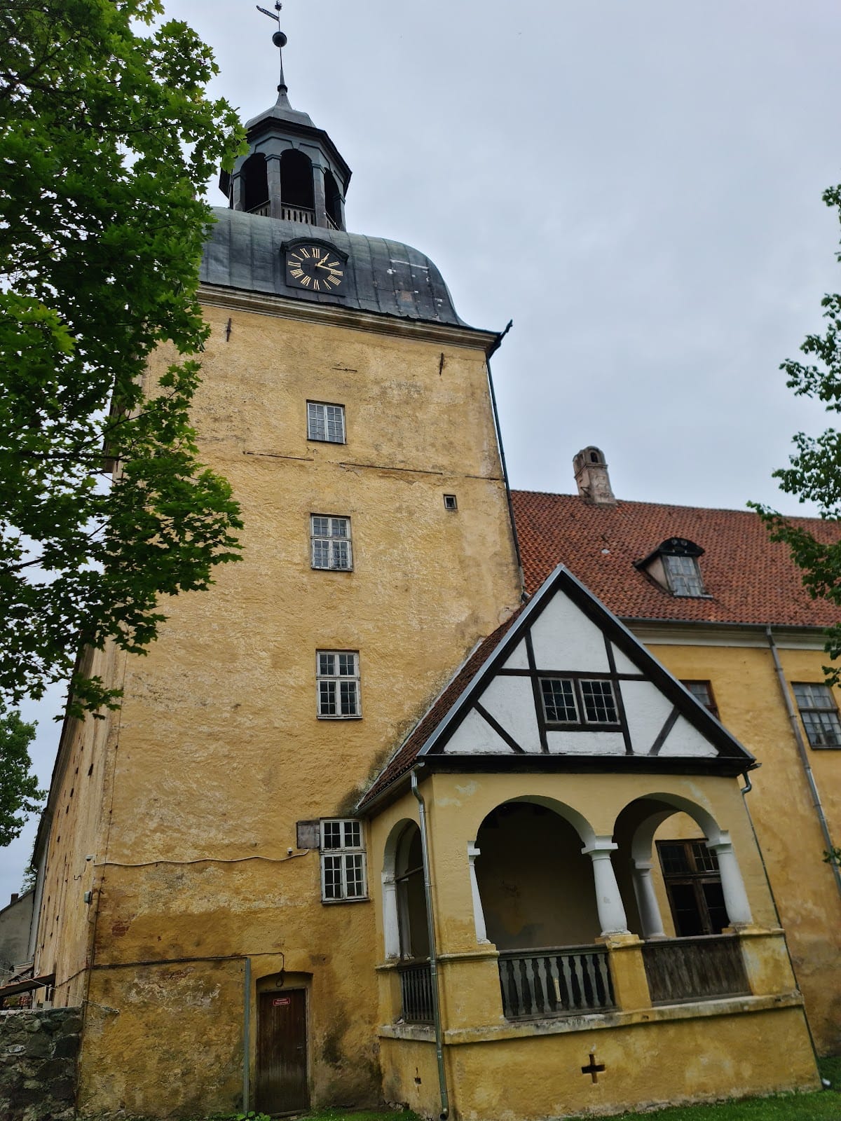 Dominating the junction of the two wings is a nearly square tower measuring about 9 by 9.45 meters, featuring walls up to four meters thick. This massive tower is considered the oldest surviving element, dating back to the original 13th-century fortress. It rises four floors high and is crowned by a Baroque curved roof topped with an open lantern and a weather vane dated 1743. Each side of this roof carries a clock face installed by a local craftsman, incorporating timekeeping into the castle’s silhouette. Remarkably, the tower’s clock mechanism includes wooden components, a detail preserved through restoration.