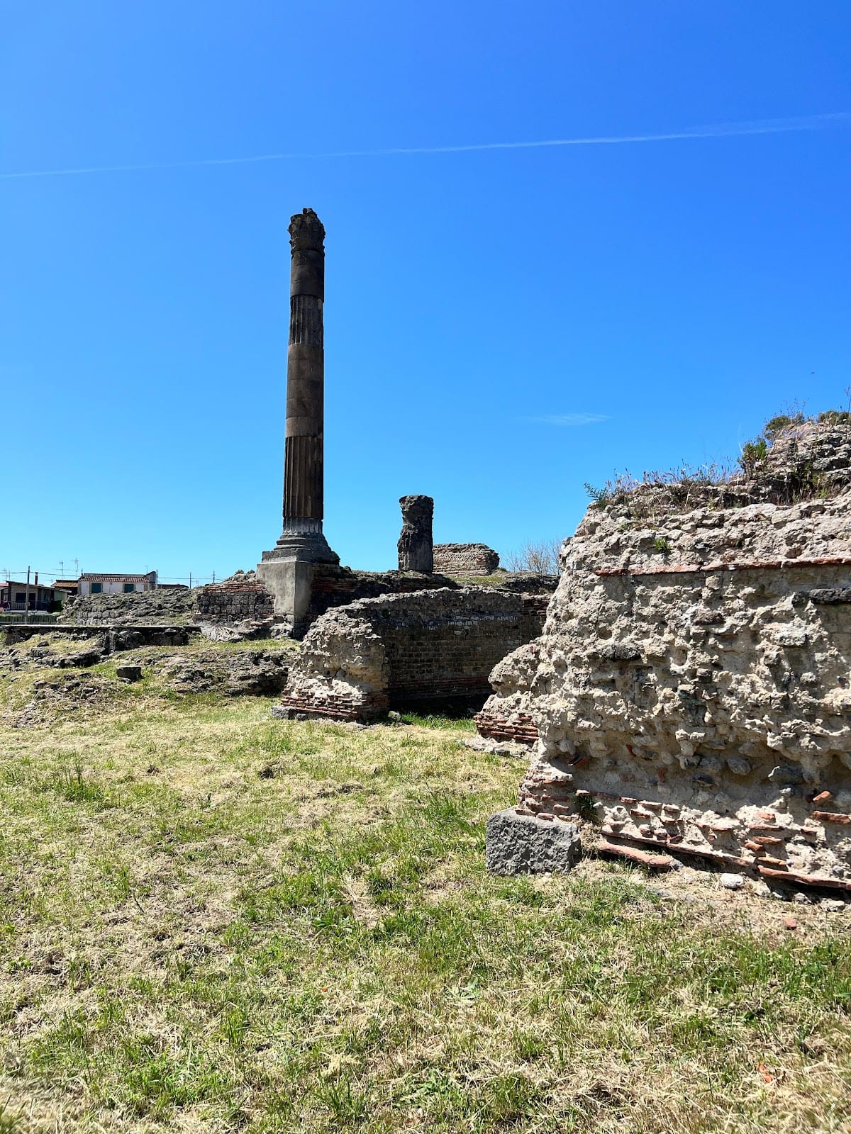 The forum, established at the colony’s foundation in 194 BCE, served as the civic and religious center of Liternum. This large rectangular space, measuring approximately 97 meters in length and 42 meters in width, was surrounded by porticoes on three sides. The northern side accommodated the Capitolium and Basilica, both dating to the 2nd century BCE. The paved Via Domitiana, constructed in the early 1st century CE, passed through the forum’s center along a north-south axis, cutting through the portico and prompting partial reconstruction of the colonnades. Excavations conducted in the 1930s revealed the forum’s layout and associated architectural elements, confirming its role as the focal point of public life.