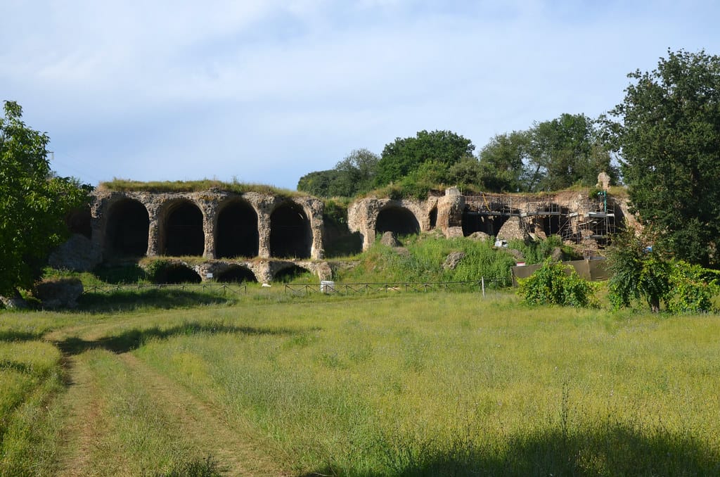 The monumental nymphaeum, dating from the late 1st century BCE to early 1st century CE, measures about 50 meters in length. Built in opus reticulatum, its façade features alternating semicircular and rectangular niches housing three fountains. The nymphaeum is connected by tunnels to a cistern within the Antiquarium Casale San Fulgenz and was supplied by the San Vittore river’s waters. It formed part of a series of buildings creating a monumental façade on the valley slope, demonstrating advanced hydraulic engineering.