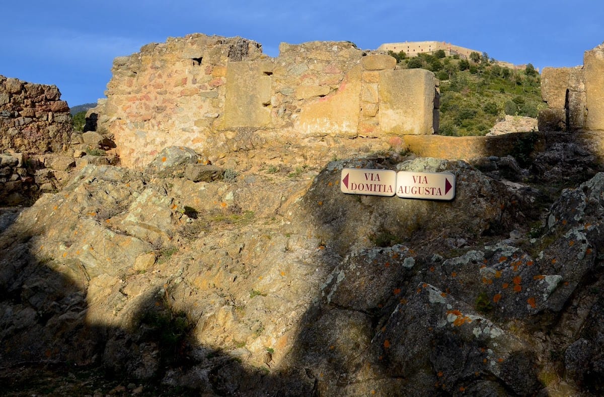 The Via Domitia, constructed beginning in 118 BCE as the first Roman road in Gaul, crosses the site and is preserved in its full original width. This segment retains durable paving stones and structural integrity, marking a principal artery connecting Italy, Gaul, and Hispania. The road intersects with the Via Augusta at Panissars, underscoring the site’s role as a crossroads.