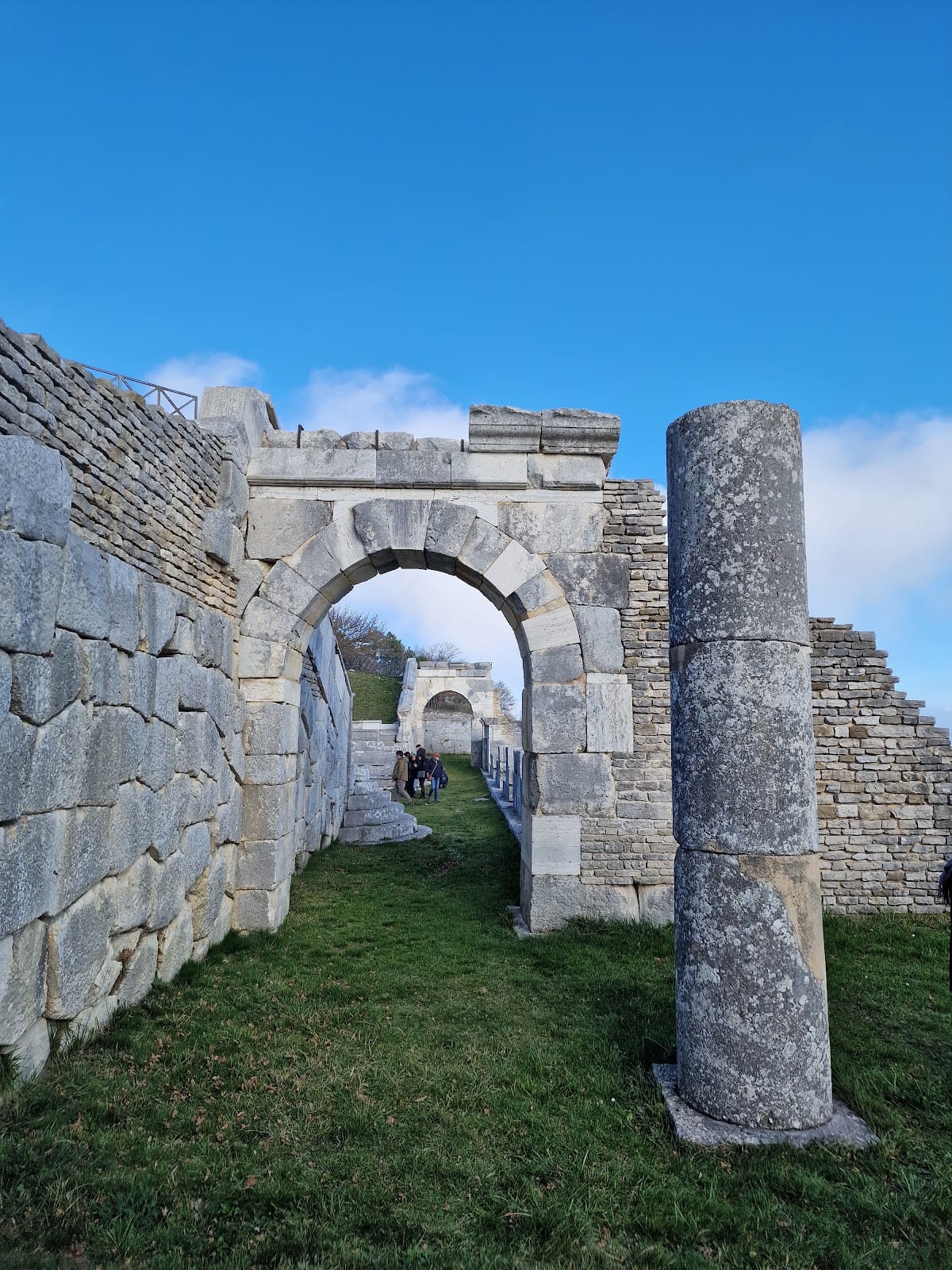 The ruins of Pietrabbondante are partially preserved, with the theater’s stone seating and orchestra area remaining visible, though some sections are fragmentary. Foundations and podiums of Temple B and Temple A are clearly delineated, while the domus publica’s structural elements, including the atrium and portico, survive in partial form. Conservation efforts by Italian heritage authorities have stabilized many structures, particularly the theater and temples, employing original materials where feasible. Some areas have been consolidated to prevent further deterioration, though no extensive modern reconstruction has been undertaken. Vegetation growth and natural erosion continue to pose challenges to preservation. The sacellum’s remains retain evidence of deliberate early 5th-century dismantling, preserved in situ.