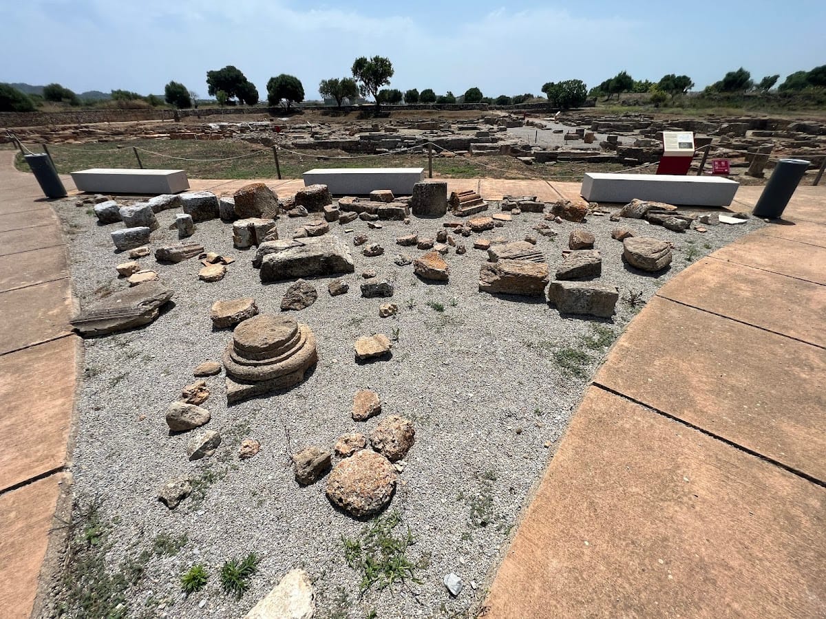 One notable residential area is Sa Portella, situated near the modern church of Sant Jaume in Alcúdia. It contains several Roman dwellings arranged along organized streets. Among these, the Casa dels dos Tresors stands out, built around a central atrium with surviving columns of its entrance portico. Opposite this house lies the Casa del Cap de Bronze, a villa featuring a colonnaded walkway where excavations uncovered a bronze head of a young girl. Additionally, the Casa Nord-oest is identifiable by its foundations, which support a fragment of the city’s 3rd-century defensive wall.