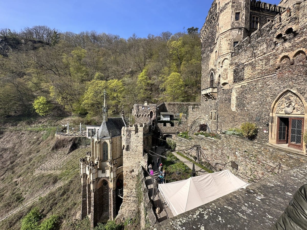 Rheinstein Castle is built as a spur castle on a rocky promontory about 90 meters above the Rhine River. Its terraced layout follows the hillside slope, with stone as the primary building material. The complex includes the main castle, outer bailey buildings, fortifications, and a chapel.