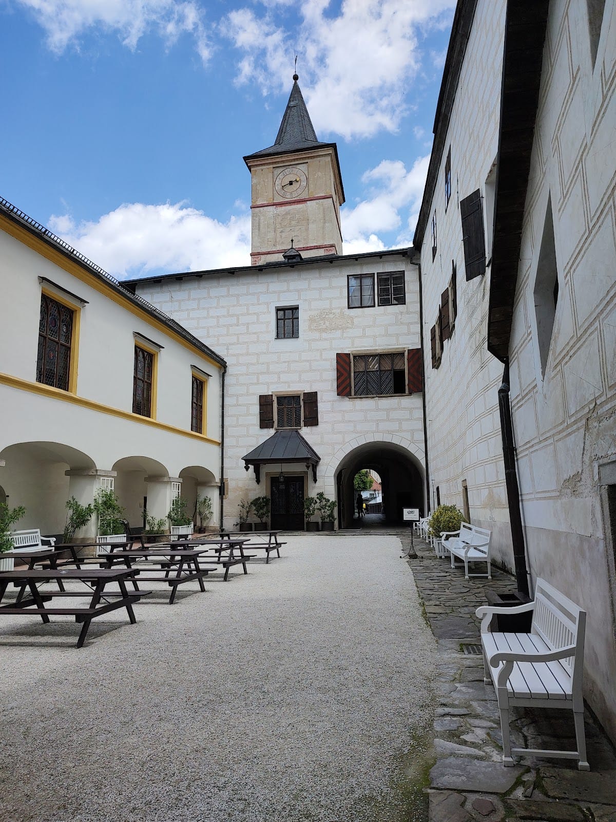 Visitors approach the main castle entrance from the north, crossing a ditch before passing through a Renaissance rusticated semicircular stone portal. This entryway still bears traces of Mannerist painted decoration, an artistic style marked by elaborate and stylized elements. Beyond the gate is a vaulted passage with lunettes, semicircular wall spaces often containing windows or decorations.