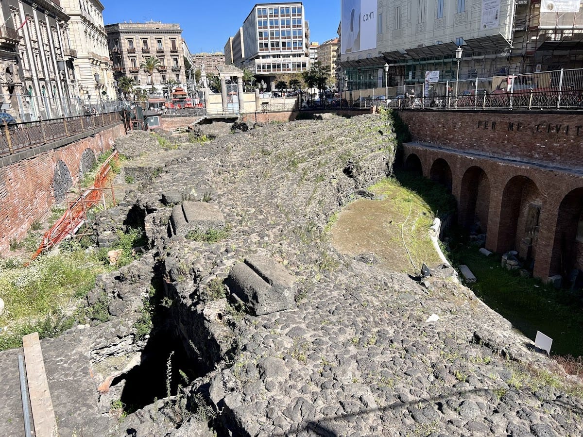 Today, only about one-tenth of the amphitheatre is visible above ground, mainly near Piazza Stesicoro and Vico Anfiteatro, where the structure rises up to the third floor. Until 2007, parts of the second floor were visible from Via del Colosseo but are now covered by the terrace of Villa Cerami, which houses the University of Catania’s Faculty of Jurisprudence. Inside Villa Cerami, parts of the vaulting system connecting the amphitheatre to Montevergine hill remain visible. The majority of the amphitheatre lies buried beneath modern streets such as Via Neve, Via Manzoni, and Via Penninello.