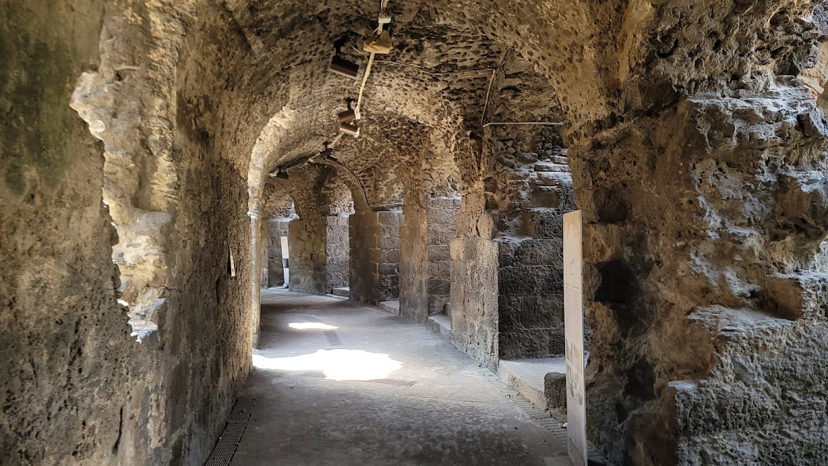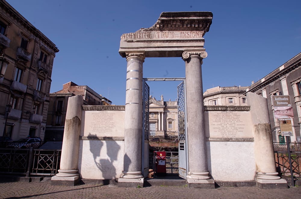 A tradition, though unconfirmed, holds that mock naval battles, or naumachiae, were staged by flooding the arena using the ancient Roman aqueduct of Catania. The excavated section is accessed through an iron gate decorated with fragments of marble columns, two fragmentary Ionic capitals, and an architrave inscribed with “AMPHITHEATRVM INSIGNE.”