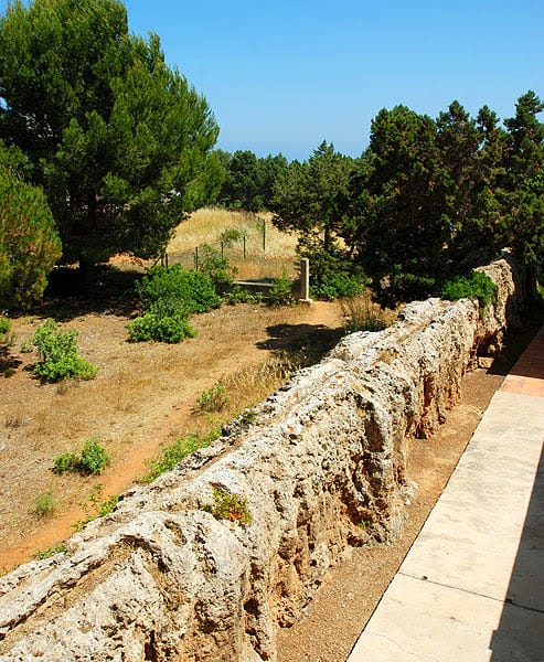 The archaeological remains at S’ Argamassa include a long aqueduct and the ruins of a fish processing installation. The aqueduct extends approximately 425 meters, running from northwest to southeast, with its southern end near the sea standing about 2.8 meters high. It gradually descends to 0.3 meters at the northwest end. Near the coast, the aqueduct splits into two branches; the western branch, partly excavated and heavily damaged, likely led to a cistern that has yet to be located. The eastern branch is hidden beneath vegetation and modern gardens.