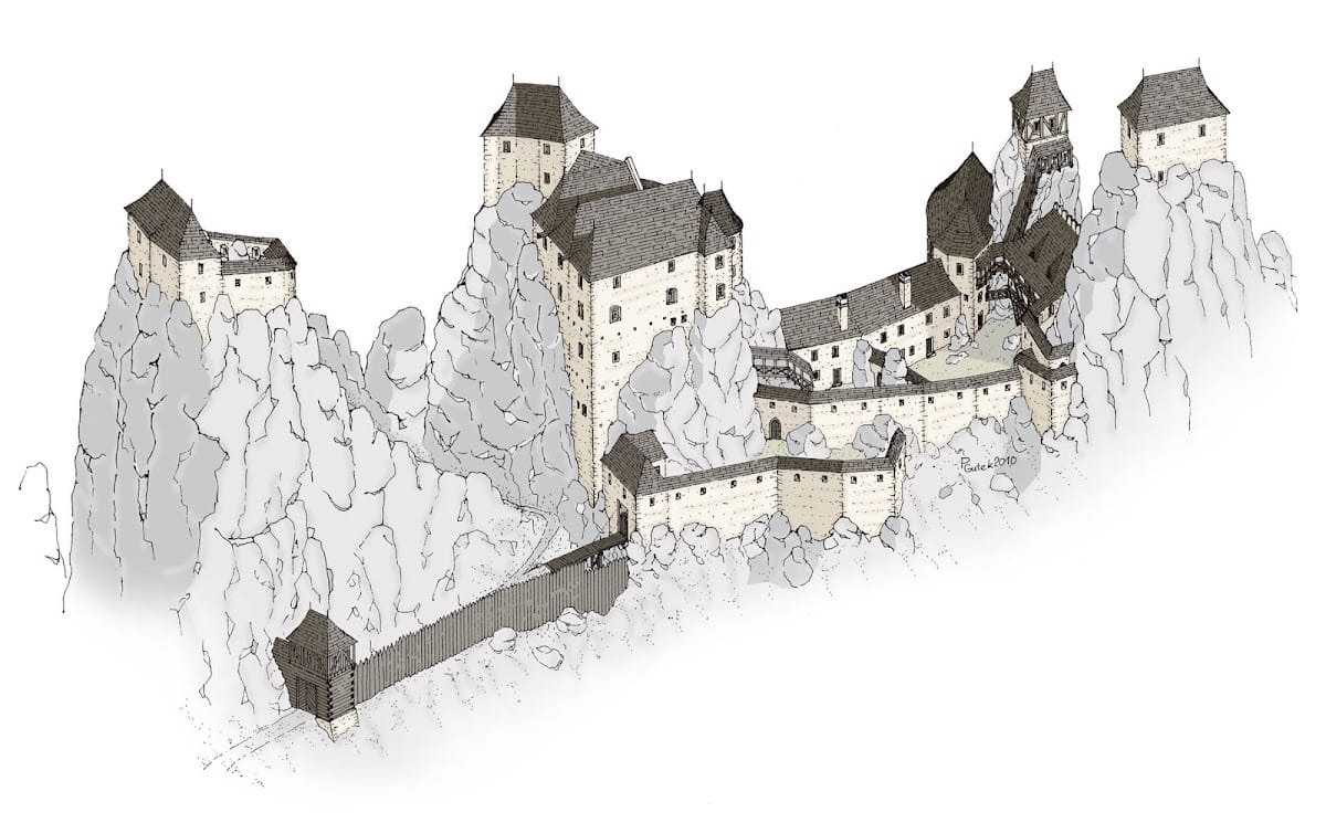 The earliest fortifications on the site likely appeared in the first half of the 15th century as a modest stone tower or small keep intended to guard this important passage. By 1470, the site—then known as Roháč or Rohach—was officially recognized when King Matthias Corvinus granted permission to expand and strengthen the existing structure into a full castle. This reconstruction phase probably employed Italian craftsmen and transformed the defensive position into a more formidable fortress suitable for the late medieval period.