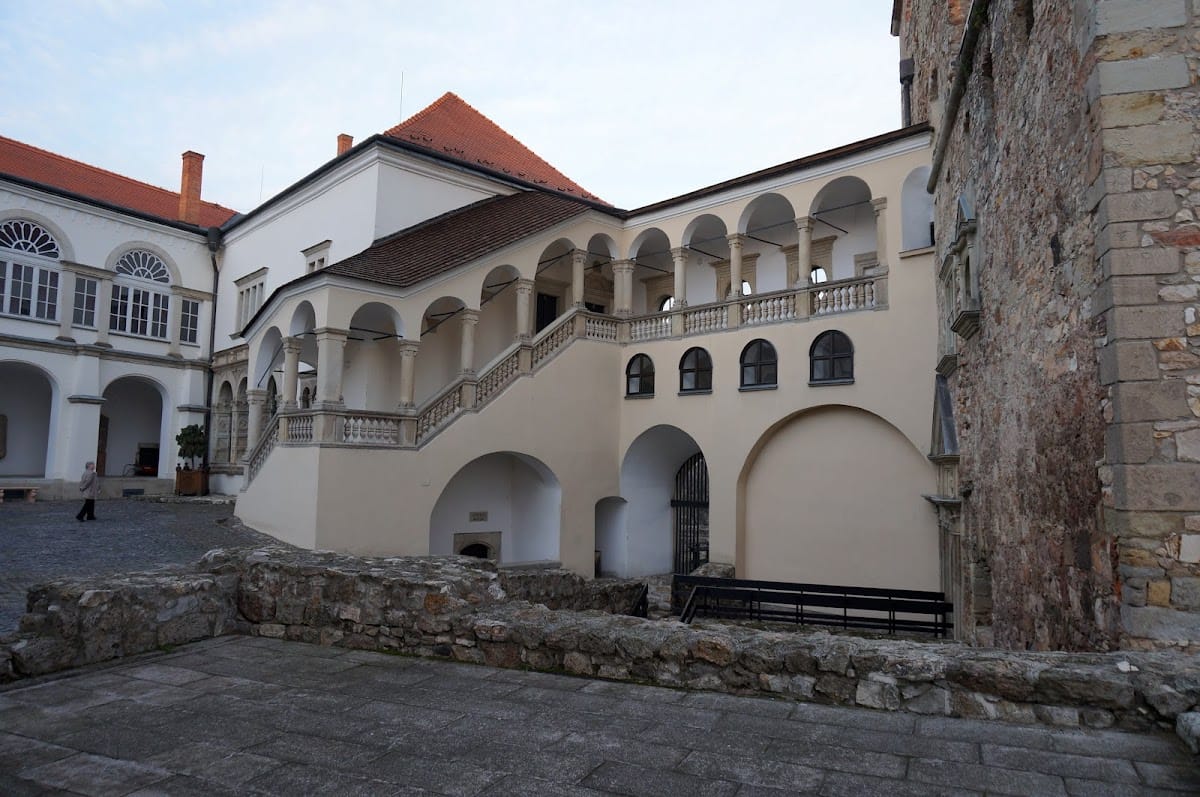 One of the courtyard’s most valued architectural features is a columned arcade staircase, accompanied by the Lorántffy loggia. This balcony connects the eastern wing to the Red Tower and honors Lorántffy Zsuzsanna’s contributions to the castle’s expansion. In the northeastern corner bastion, a 17th-century “Sub-Rosa balcony” features a round chamber with a vault bearing a painted keystone decorated with a stylized rose, symbolizing confidentiality. Exterior bastion corners carry later additions from the 19th century in the form of closed circular balconies.
