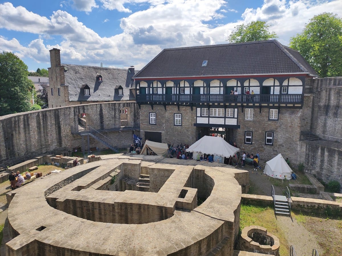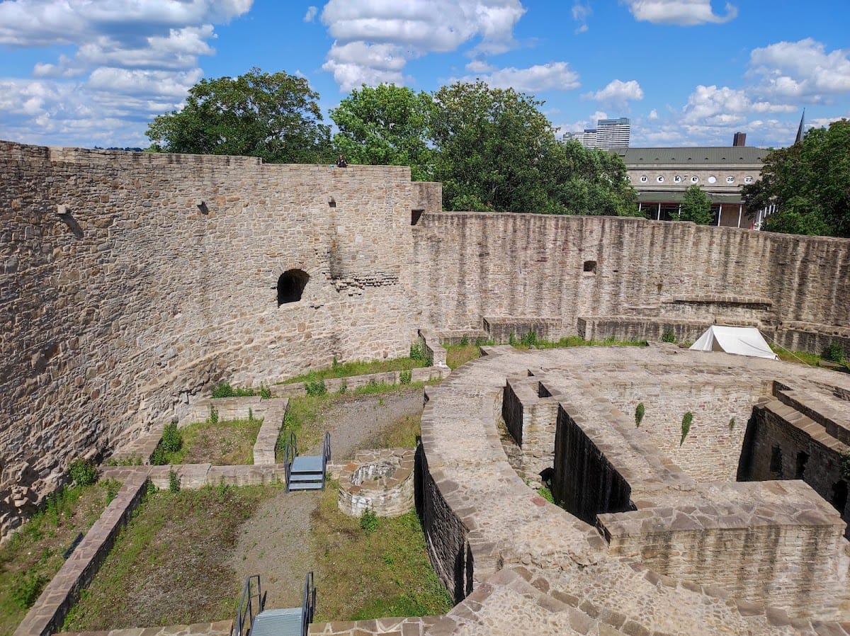 Recently, between 2010 and 2020, the ring wall underwent extensive restoration to address severe structural damage, including the replacement of large, falling stones. Today, the surviving elements of Schloss Broich include representative event spaces such as the knights’ hall, fireplace room, and coat-of-arms room, all housed within the restored medieval and early modern buildings. The Hochschloss houses the local history museum, and office spaces occupy the upper floors, maintaining continued use of this historic fortress in the heart of Mülheim an der Ruhr.