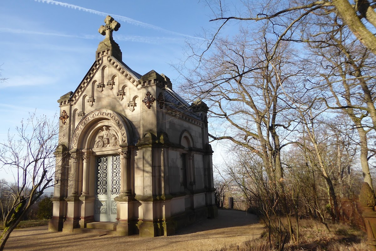 One of the most visually striking features of the site is the Goldene Kreuz, or Golden Cross, an approximately 8.5-meter-tall gilded cross erected in 1866. It stands on a base made of black syenite, a durable igneous rock, and was installed to honor Grand Duchess Wilhelmine. This landmark is visible from across the Rhine plain, marking both a memorial and a point of orientation.