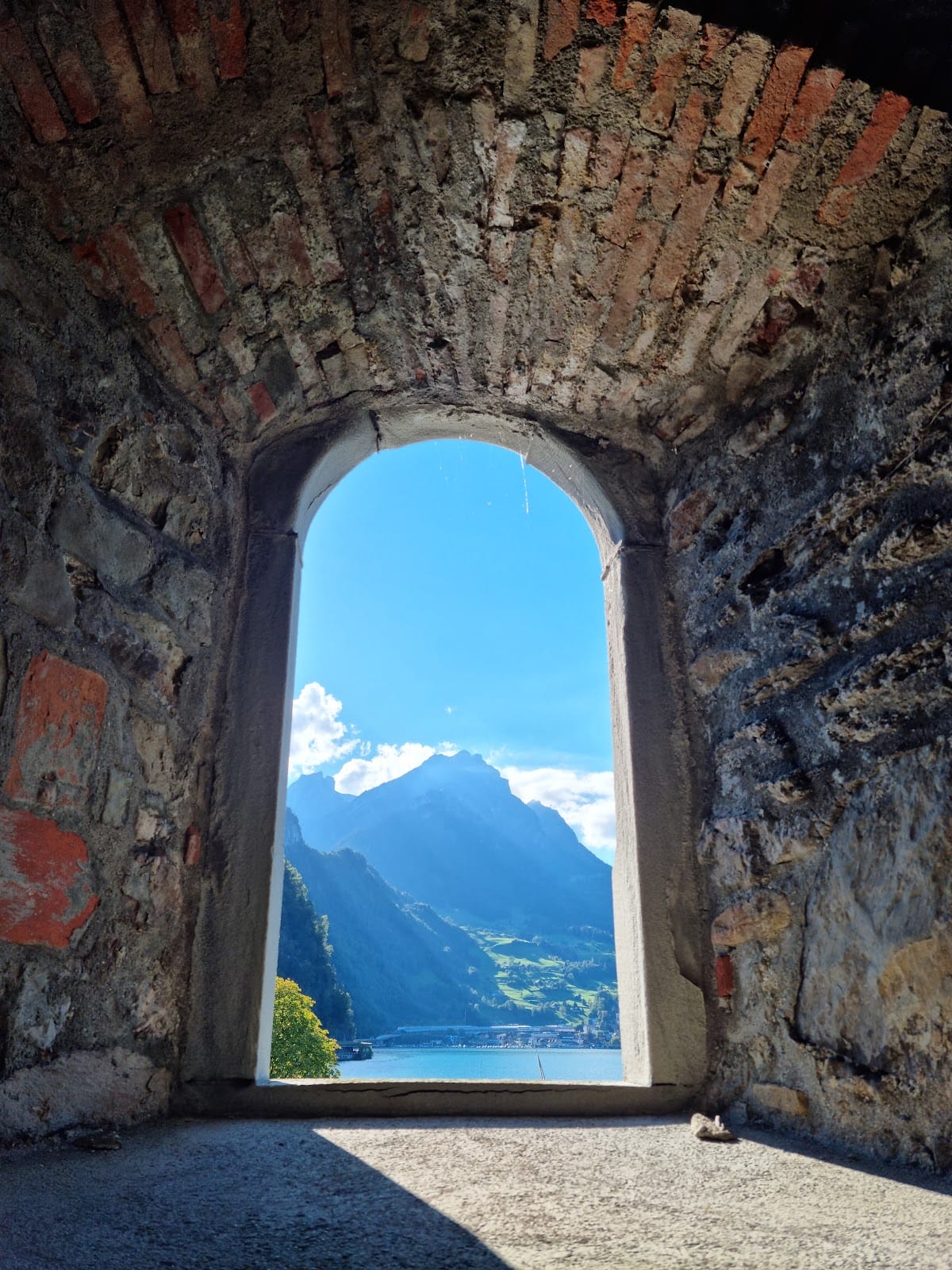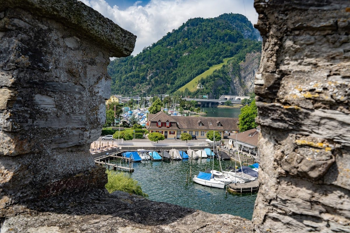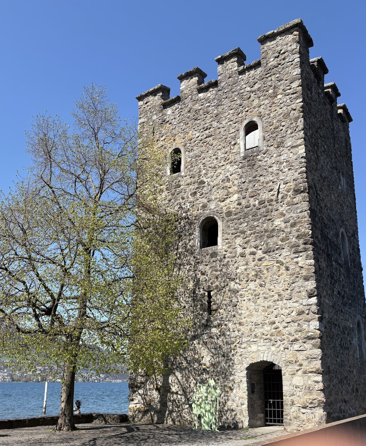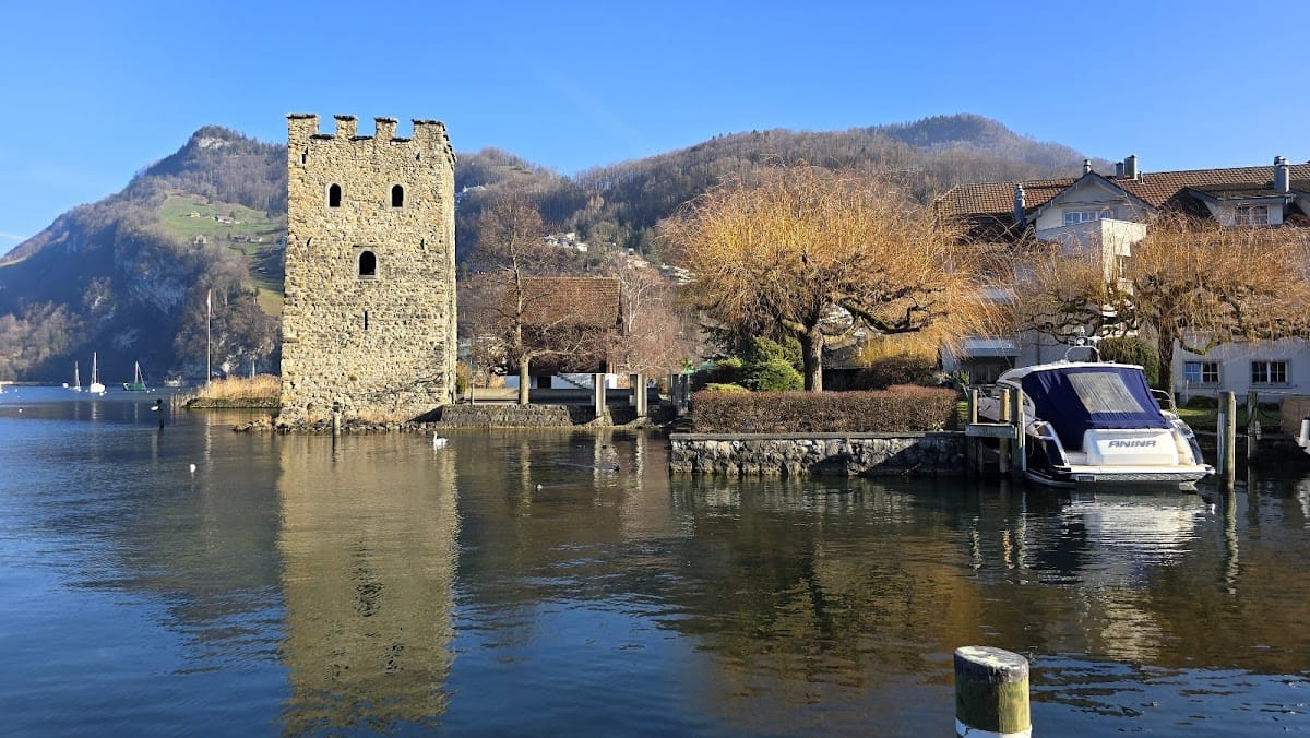 The 1880 restoration restored the tower’s medieval character by adding a staircase, an observation platform, and reinstating crenelations that had existed before the 1635 roof. The tower remains largely intact and accessible, preserving its stone construction and defensive features. It stands as a well-preserved example of medieval military architecture on Lake Lucerne’s shore.