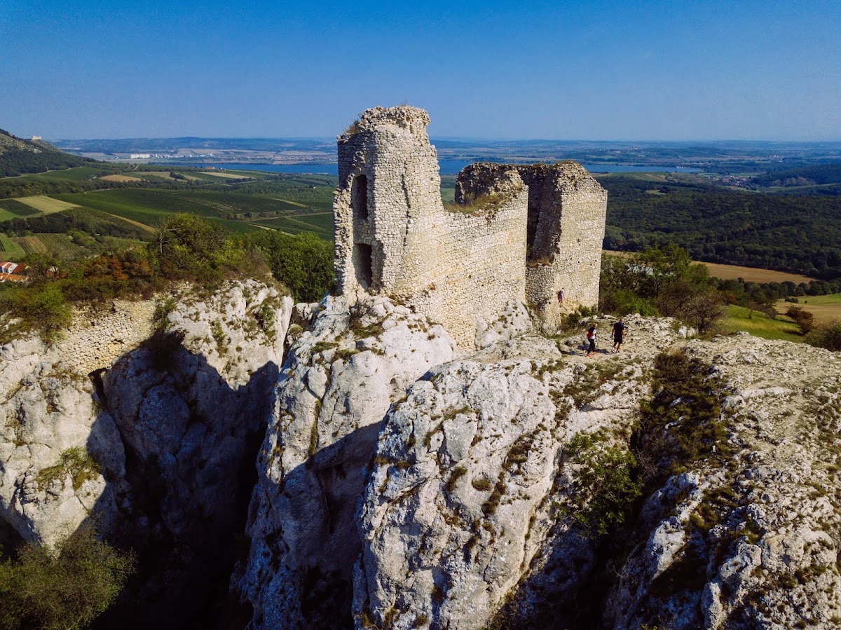 The remains lie at an elevation of 458 meters on the northern edge of Stolová hora within the Pavlov Hills, an area designated as a national nature reserve and protected landscape. From the ruins, one can view several historically important sites, including nearby Děvičky Castle, the Devín Castle across the Slovak border, and various natural landmarks such as the Nové Mlýny reservoir and the White Carpathians. These views reflect both the castle’s strategic location and its connection to the wider landscape.