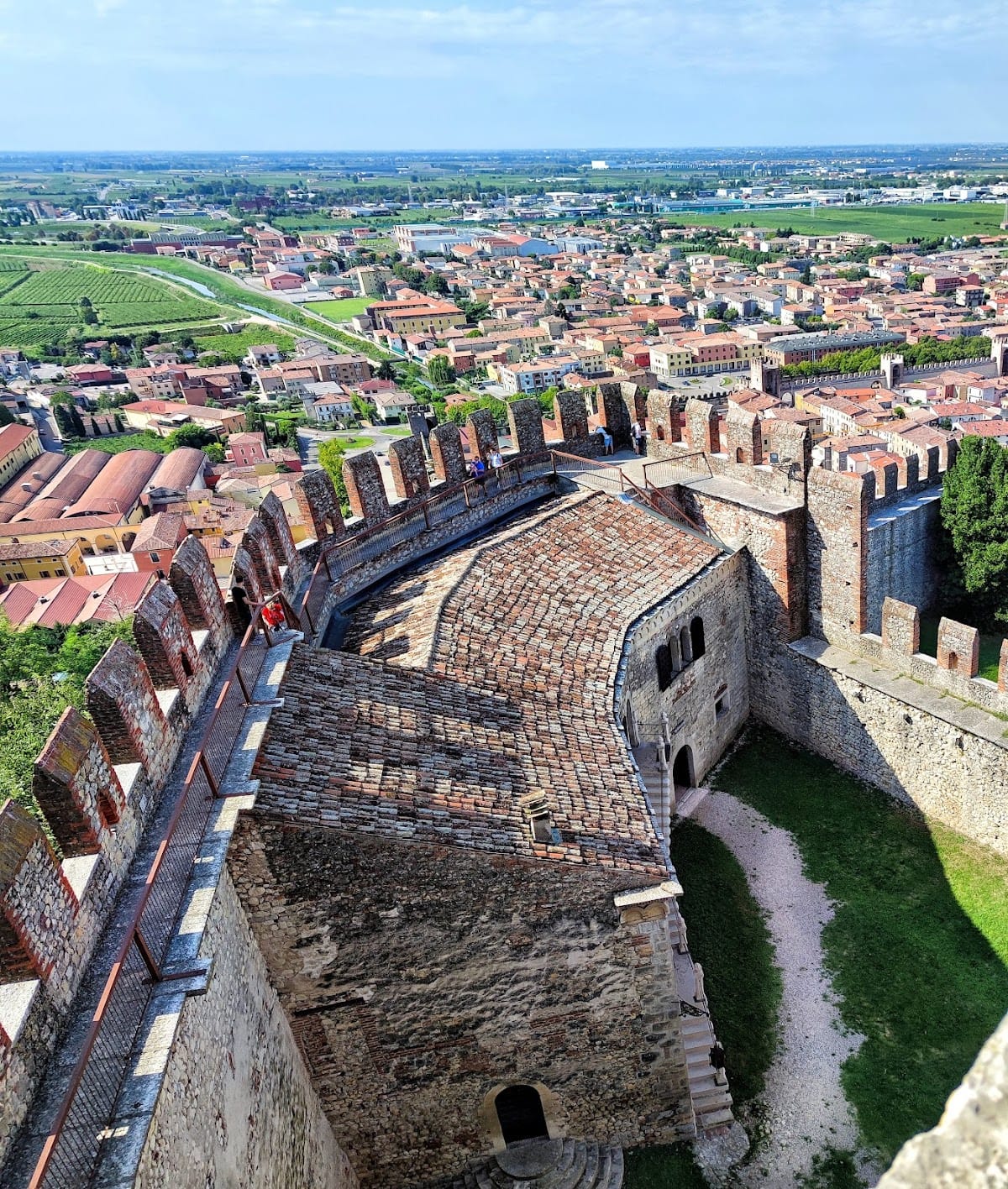 Soave Castle stands as a medieval military complex constructed predominantly of strong masonry suited for defense. Situated on the summit of Monte Tenda, it commands a broad view of the surrounding plains. The fortress consists of a central mastio, or keep, and three courtyards arranged at different levels, each serving distinct functions and built during various phases of the castle’s history.