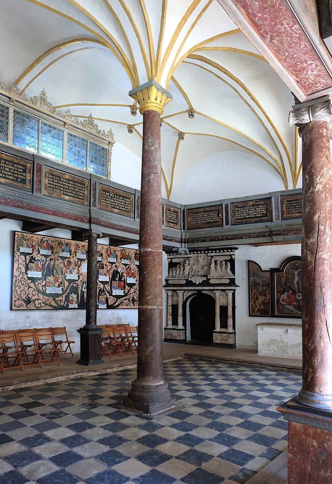 Within the chapel lies a burial crypt dedicated to Duke Hans II, distinguished by an elegant door crafted from marble and alabaster. Interior woodwork dating from the early 1600s, created by local artisans, adds to the chapel’s rich historic character. The Knights’ Hall continues its use today for special ceremonial occasions, including weddings, preserving its status as a significant interior space.