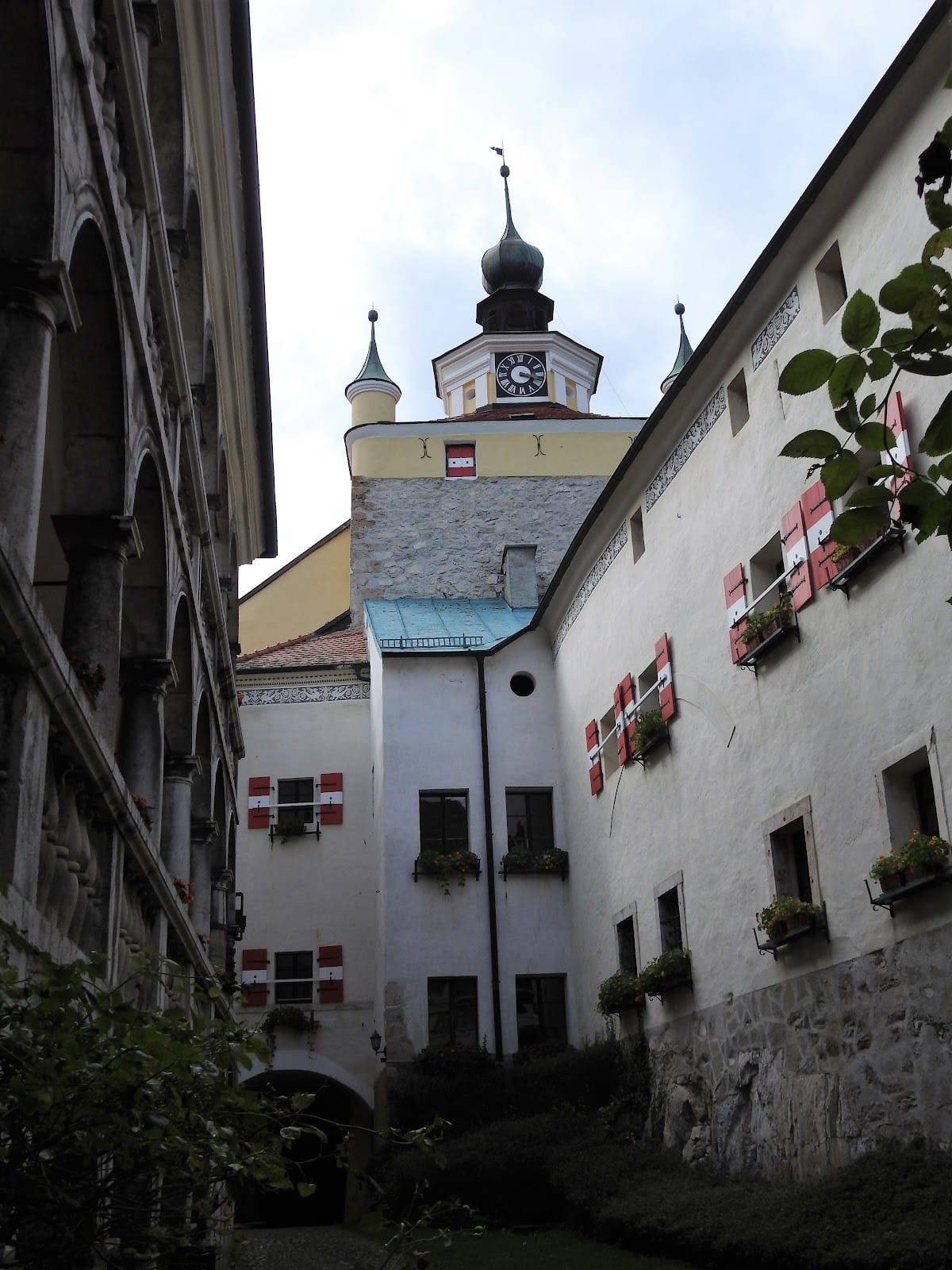 Strechau Castle is arranged around a central courtyard, featuring medieval and Renaissance construction elements that reveal its complex history of adaptation and expansion. The castle’s main entrance stands beneath a gate built into the former bastion, a defensive fortification projecting outward from the main walls. Above this entrance is a projecting oriel, a type of enclosed lookout that would have provided additional defensive advantage. The bastion itself contains three oval openings in the wall, designed to hold cannons—a reflection of early modern military technology integrated into the medieval fortress.