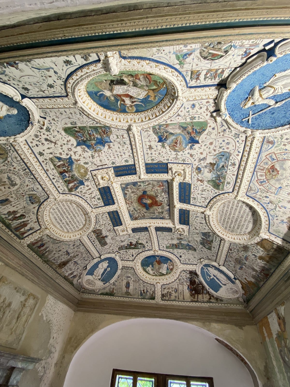 On the second floor of the east wing is a grand hall with a richly decorated ceiling from 1652. This ceiling blends stucco work with oil paintings that depict scenes from Ovid’s Metamorphoses, an ancient Latin poetic work recounting mythological transformations. Alongside these classical motifs, a Baroque oil painting represents the New Testament parable of the wedding feast (Matthew 22:1–14), integrating religious narrative with the decorative scheme.
