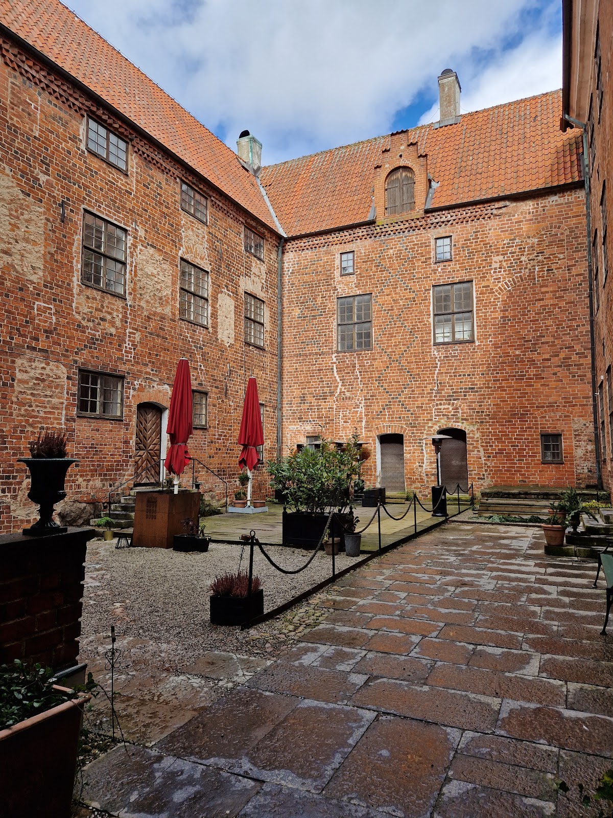 The castle’s exterior shows restrained Renaissance influence, primarily through stepped gables and a slender white frieze encircling the facade near the roofline. Inside, the layout includes several notable rooms: a long cellar area once housing the castle’s garrison, a knights’ hall occupying the first floor, and a second-floor chamber called the borgsal, or ladies’ hall. Above these levels, the attic features a shooting gallery equipped with loopholes and embrasures, offering a defensive vantage point.