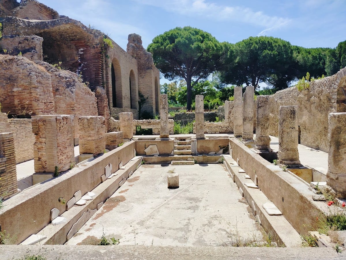 The Republican caldarium, or hot bath, has a basilica-like design with two rows of travertine columns. It contains a large central hot bath and three smaller tubs fed by sulfurous spring water. Under Hadrian, the original columns were replaced by embedded half-pillars supporting a vaulted roof decorated with Ionic capitals. At the end of the caldarium, a marble altar dedicated in Greek to the Nymphs by Alcibiades, a freedman of Hadrian, is set in an apse niche. Shelves nearby likely held votive columns representing water deities.