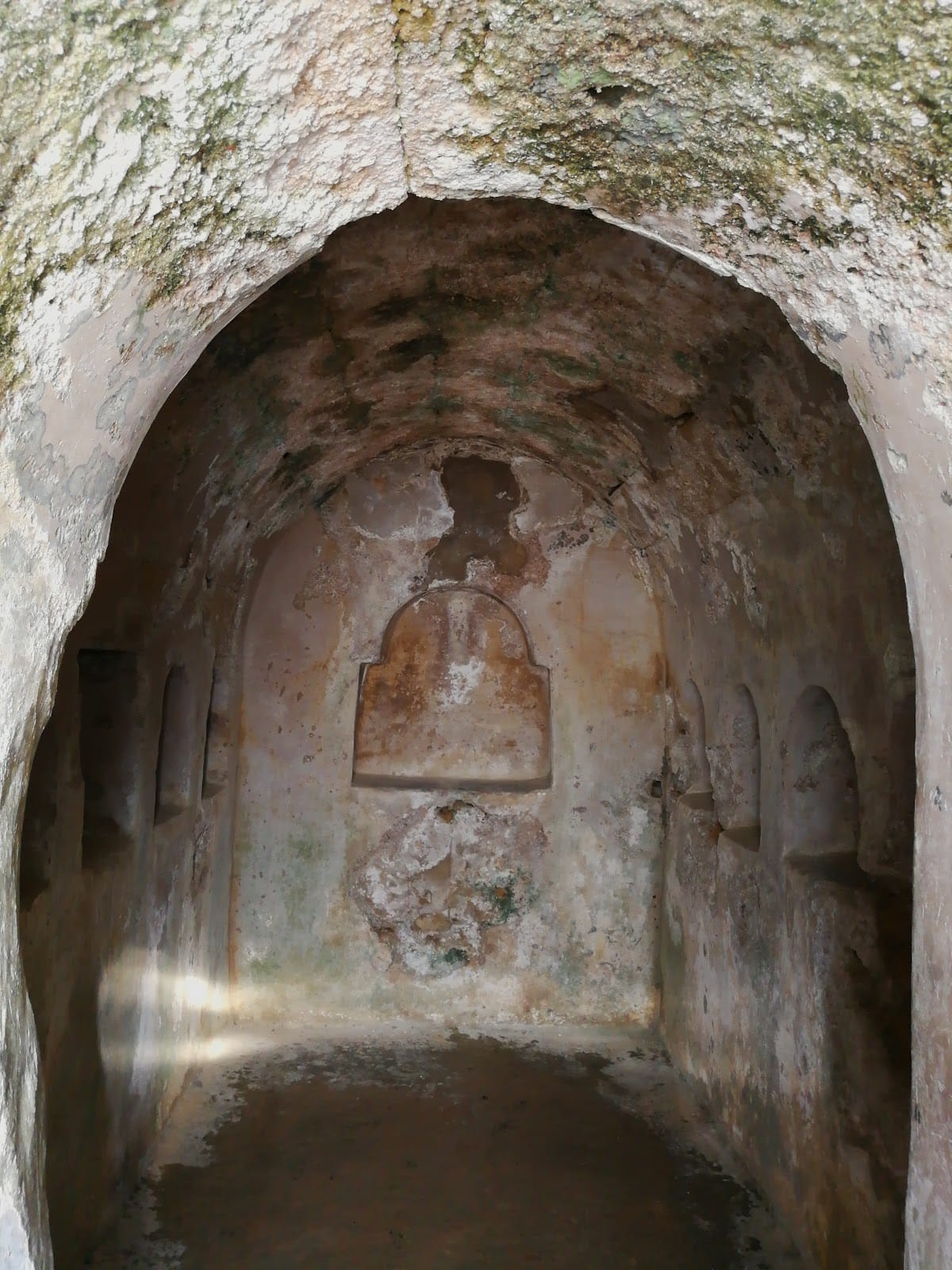 The Elephant Tomb is a rock-cut structure accessed by a staircase descending into a vaulted antechamber. This entrance chamber includes a niche on the right side. Although the original vaulted ceiling no longer survives, plans exist to reconstruct or protect it. From the antechamber, a corridor divides the tomb into two wings.