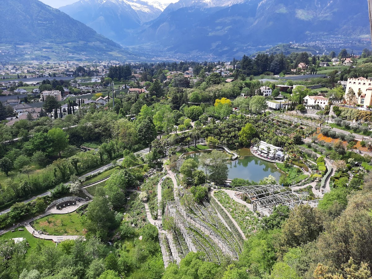 The castle estate covers about 12 hectares and includes an extensive network of paths stretching approximately seven kilometers, with a vertical elevation difference of 100 meters. The botanical gardens, developed around the castle grounds, are organized into four distinct zones: forest gardens, sun gardens, water and terrace gardens, and South Tyrolean landscapes.
