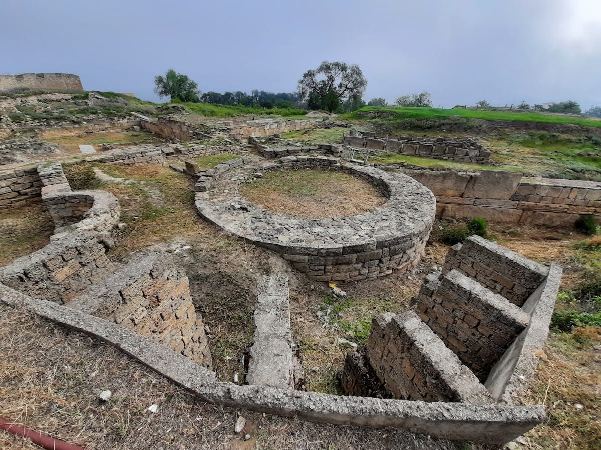 Tyras preserves a complex defensive system comprising three principal sections from distinct periods. The northern fortifications include a defensive wall and a separate round tower approximately 11 meters in diameter, constructed of large, well-cut rectangular blocks with rusticated surfaces. These features date to the late 5th or early 4th century BCE. A subsequent phase, likely postdating the late 4th-century BCE campaign of Zopyrion, added two curtain walls reinforcing the northern defenses.