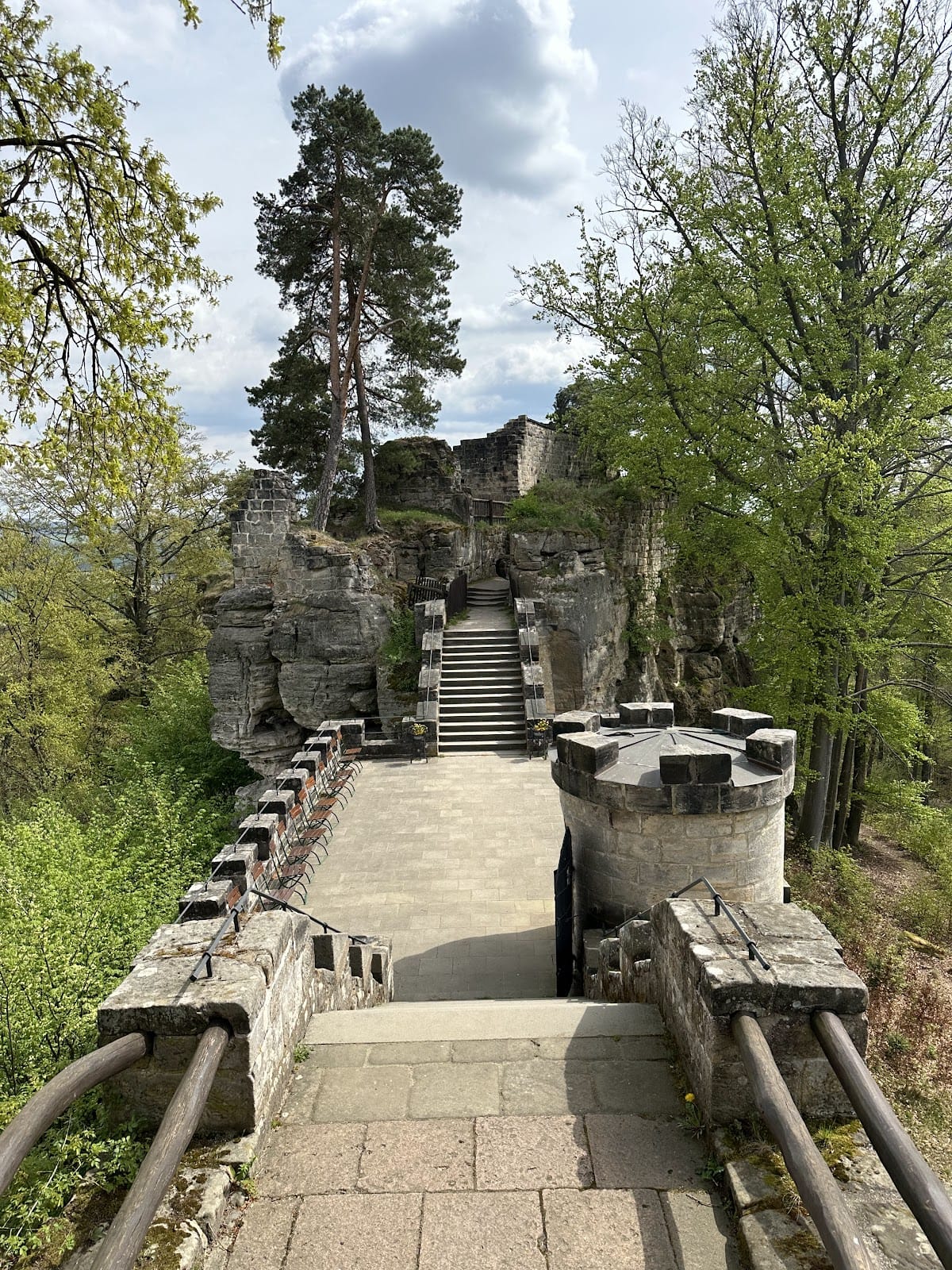 Valdštejn Castle occupies a striking position atop three sandstone rock formations linked by wooden bridges, showcasing a layout designed to maximize natural defenses. These elevated rocky outcrops are connected in a way that facilitated movement between parts of the fortress while maintaining a formidable defensive posture. The castle was enclosed by a deep ditch hewn into the terrain to impede attackers, further reinforcing its security.