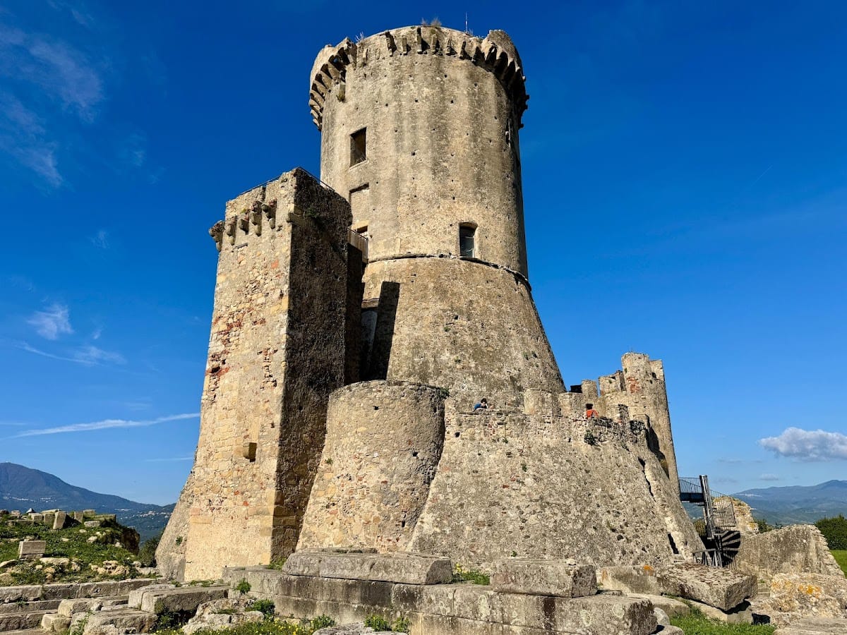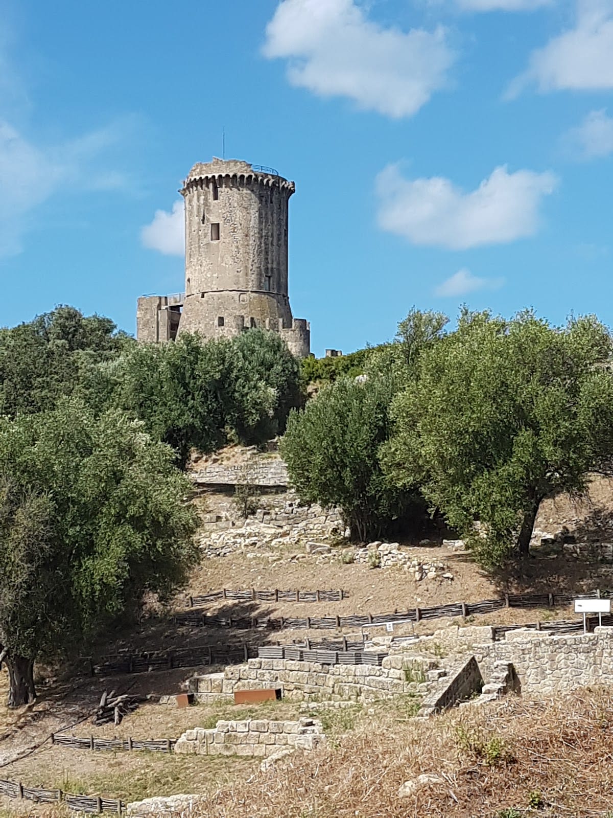 The acropolis crowns the promontory and contains archaeological evidence of a pre-Greek village, confirming earlier indigenous occupation consistent with Strabo’s account of an Enotrian settlement. Excavated in 2022, the archaic Temple of Athena dates to circa 540–530 BCE, shortly after the Battle of Alalia. Constructed with local stone, the temple’s remains include foundation walls and altar areas. The temple contained votive offerings, notably two helmets currently undergoing laboratory analysis for inscriptions that may clarify historical details about the warriors commemorated. In later periods, the acropolis served as a refuge, fortified with a substantial defensive structure known as Castellammare della Bruca. This fortification, visible today, was built to protect inhabitants from malaria and Saracen pirate raids and represents the final phase of settlement until the late 17th century.